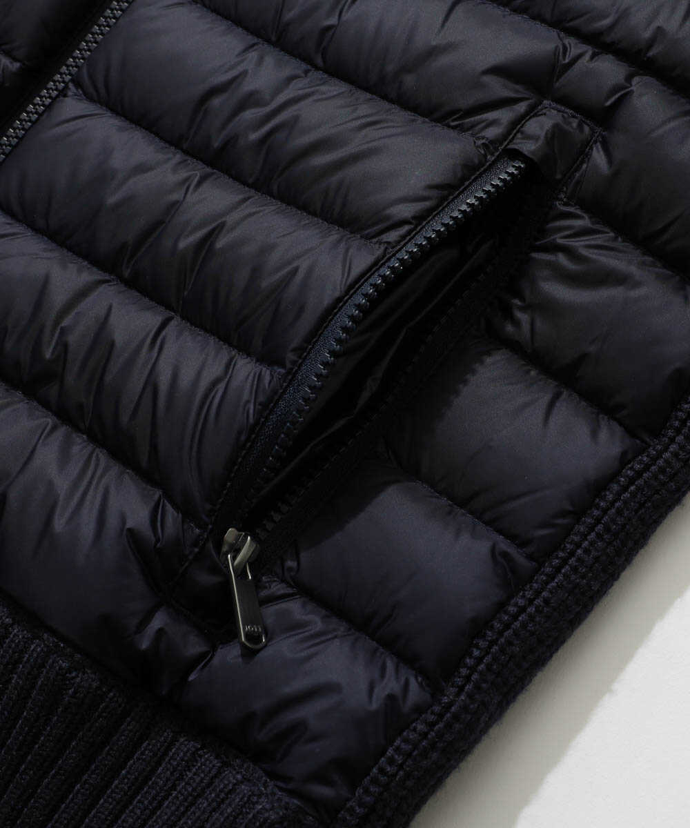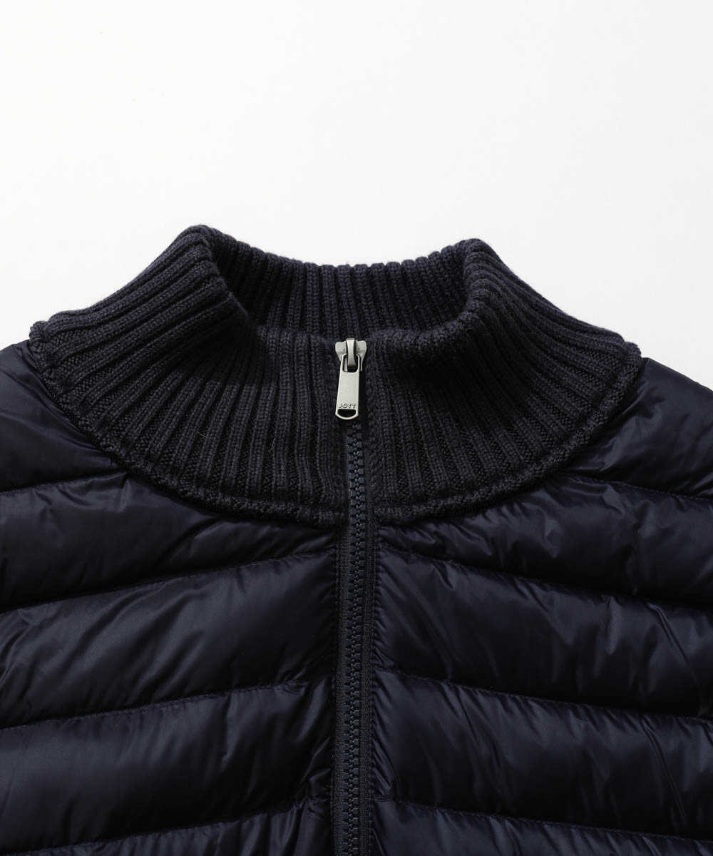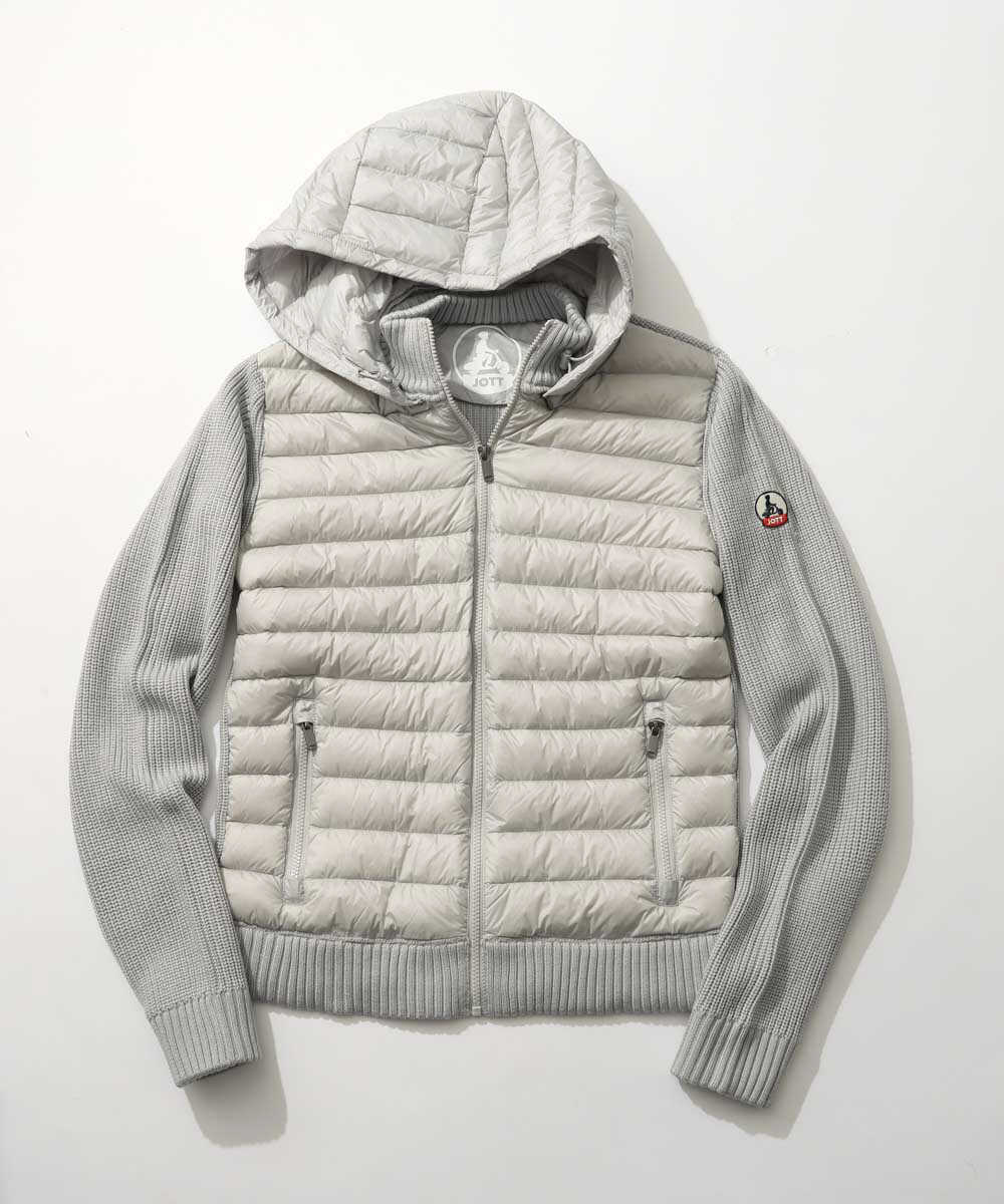 冬のアウター=ダウンという人は多いけれど、都市部で生活していると電車移動や車に乗ったりで、意外と着膨れしてしまいそうなパンパンのダウンって出番が少なかったり。とはいえ、冬の防寒性は必要なわけで、なかなか難しい問題だったりする。そんな悩みの解消にひと役買ってくれるのが今回紹介する〈ジョット〉の1着。ニットと切り替えてあるから、すっきりコンパクトで車に乗る際にいちいち脱がなくてもいいくらいだし、何よりもスタイリッシュ。これこそ街映えするダウンの最適解では!?