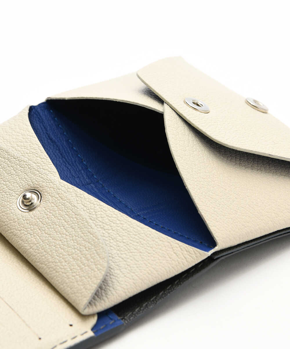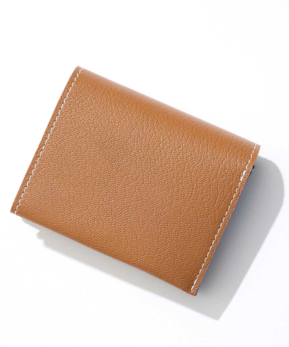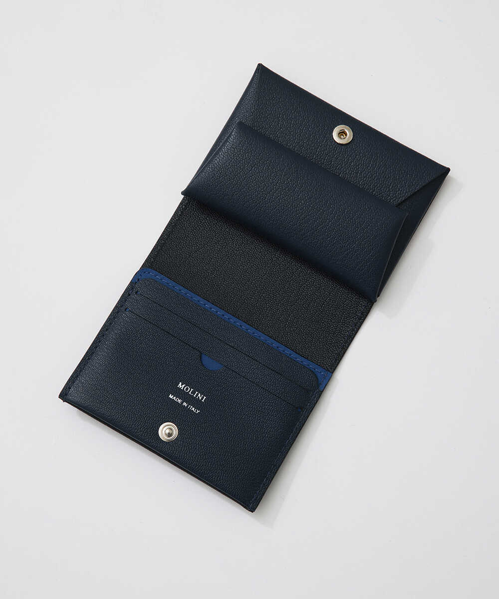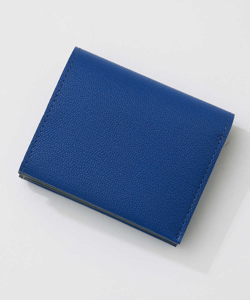 一枚革を折り紙を折りたたむように仕上げた、〈モリニ〉独自設計のウォレット。ポケットに入れても邪魔にならないサイズ感ながら、紙幣と小銭に加え、内側に3枚、外側に2枚収納できるカードポケットも装備。日本紙幣がすっぽり収まる形状なのも、デザイナーが日本人だからこそ。ゴートレザーは発色が美しく、高級感あふれる仕上がりで、アイキャッチなバイカラーのデザインなのも魅力。