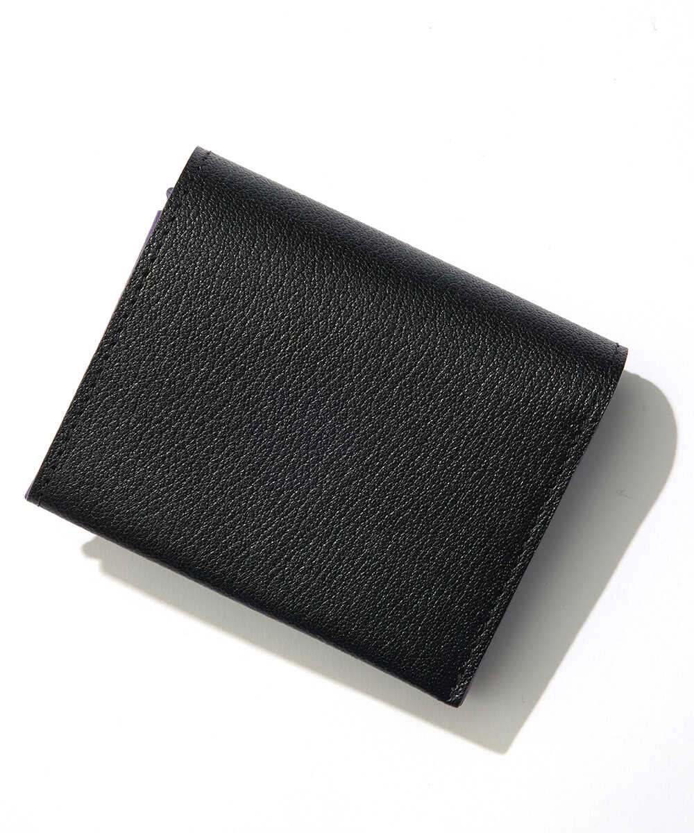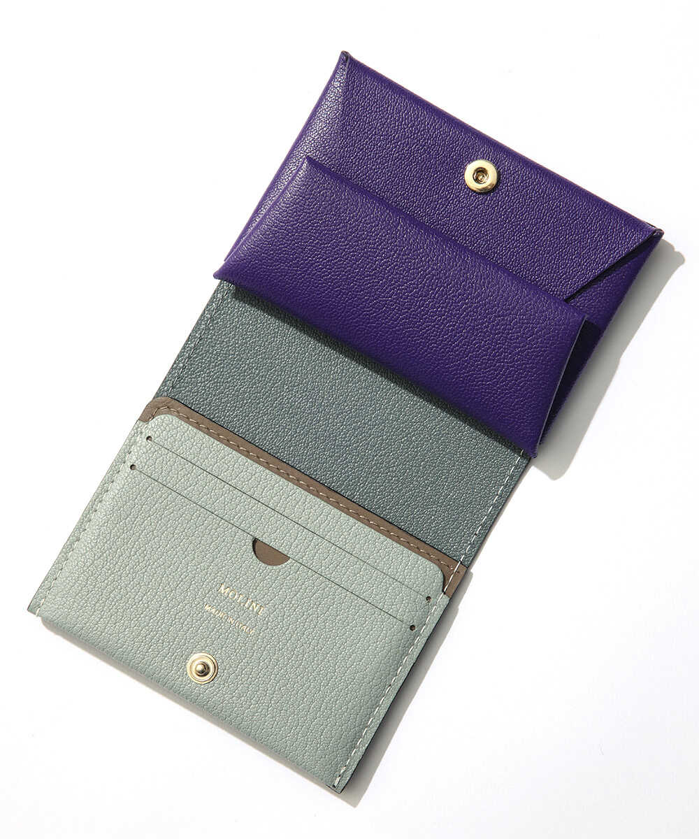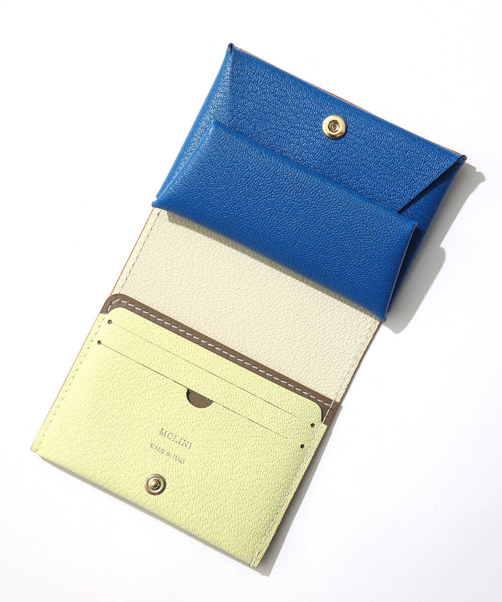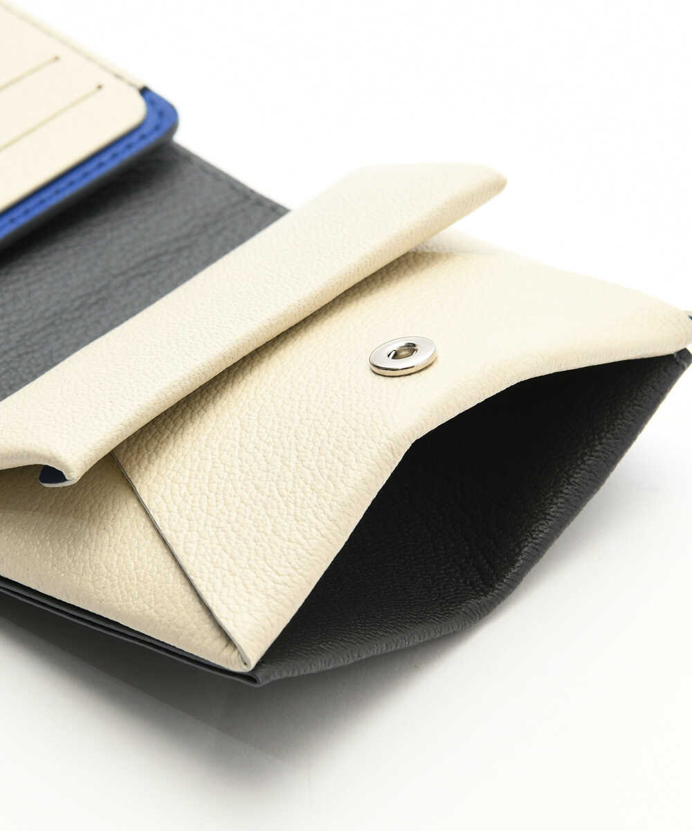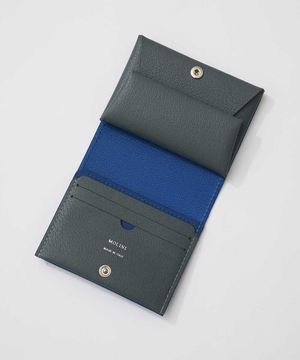 一枚革を折り紙を折りたたむように仕上げた、〈モリニ〉独自設計のウォレット。ポケットに入れても邪魔にならないサイズ感ながら、紙幣と小銭に加え、内側に3枚、外側に2枚収納できるカードポケットも装備。日本紙幣がすっぽり収まる形状なのも、デザイナーが日本人だからこそ。ゴートレザーは発色が美しく、高級感あふれる仕上がりで、アイキャッチなバイカラーのデザインなのも魅力。