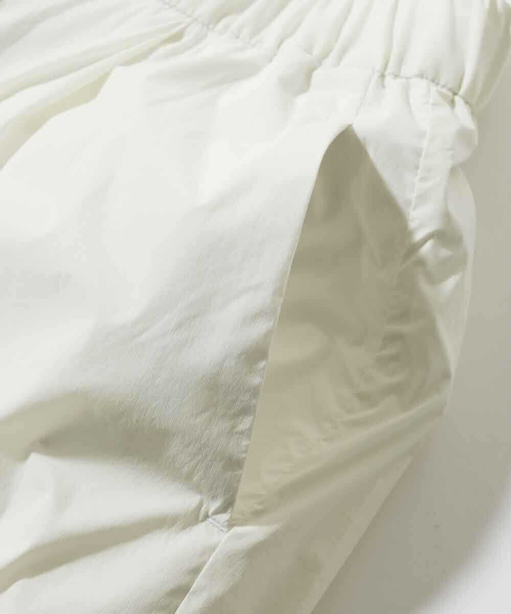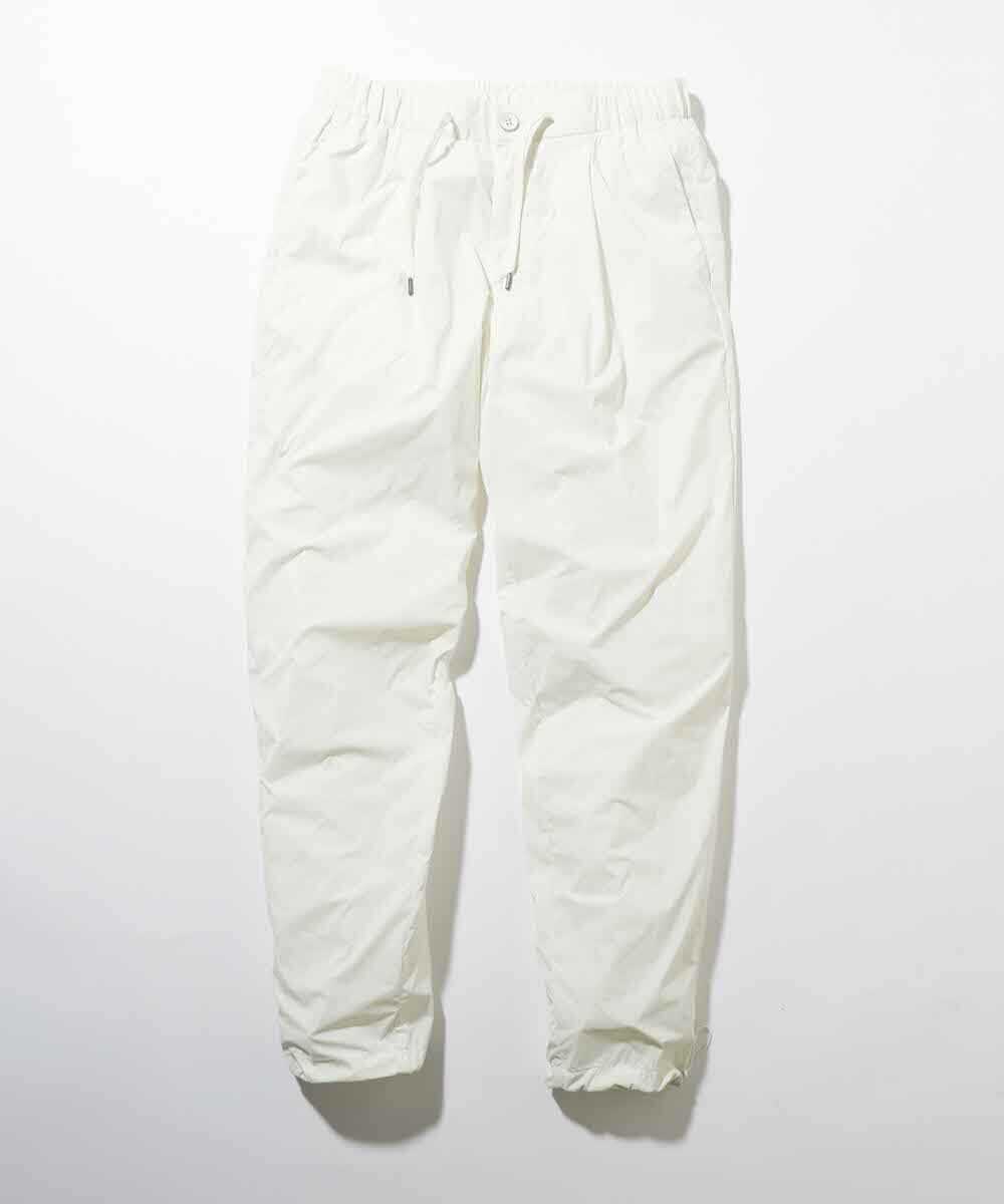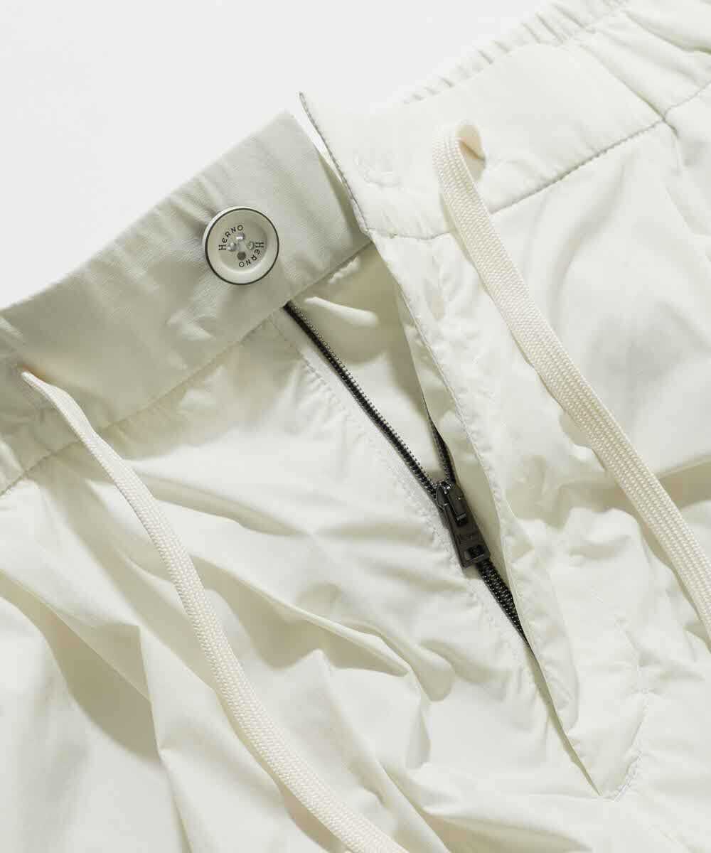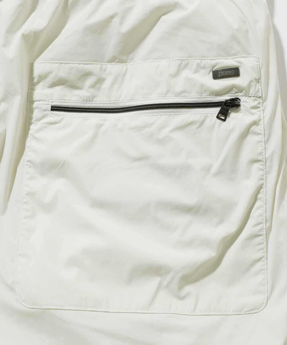 旅をキーワードに、ラグジュアリー&コンフォータブルに特化した"ヘルノ リゾート"コレクションから登場したのが白パンは、一見普通に見えて、並々ならぬこだわりが詰まった代物。素材には軽量で柔らか、高級感ある生地感に加えて、耐久性のあるナイロン地を採用。光沢を抑えたマットな色味が特徴だ。しかも、バックポケットの中にコンパクトに収納できるパッカブル仕様で、持ち運びにも便利。