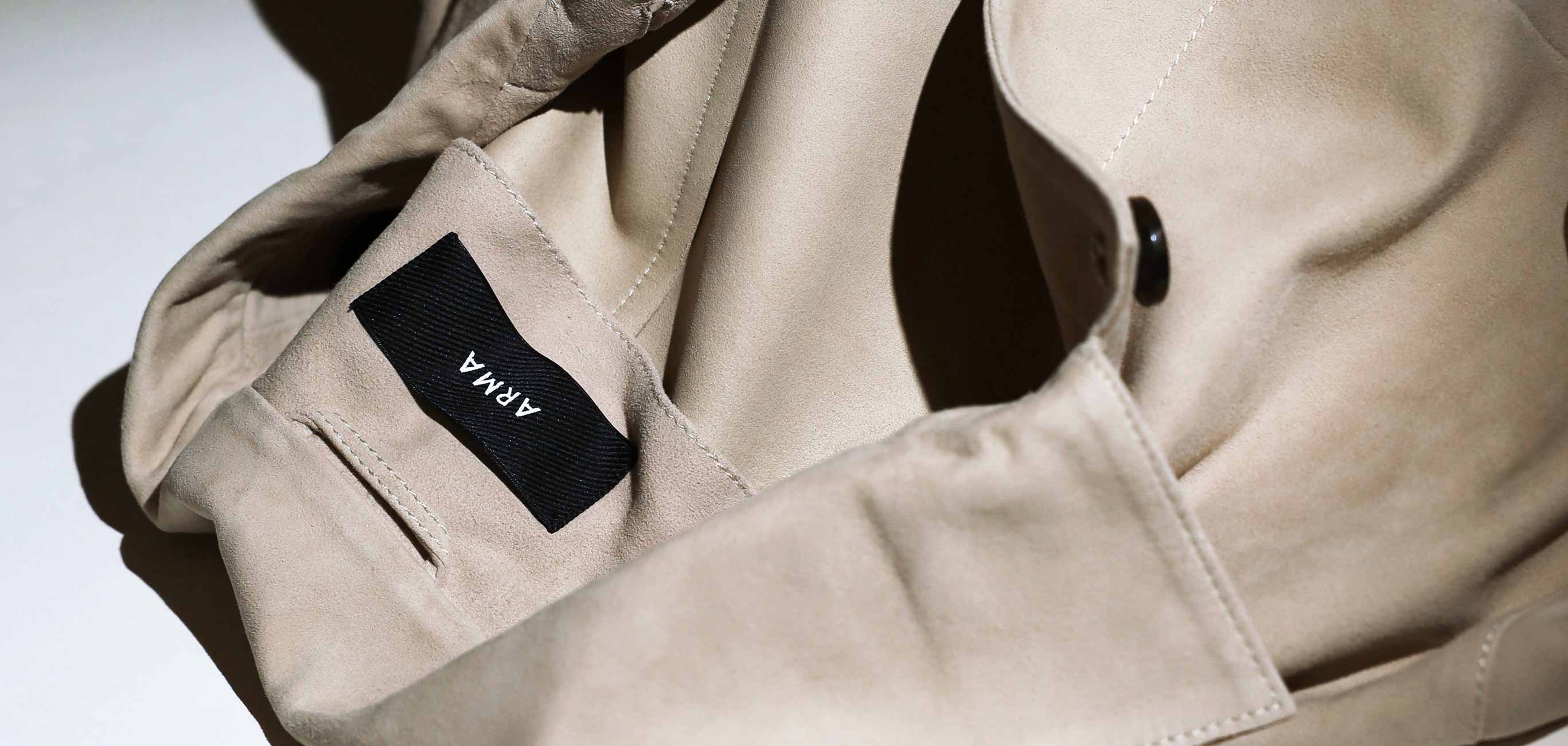落ち着いた雰囲気と品格を演出できるアイボリーカラーのレザージャケットは、オランダ発の〈アルマ〉。上品さと抜け感しかない白いゴートスウェードを採用。裏地なしのアンライニング仕立てなので、革自体の軽さと肌触りのよさを存分に味わえる。両袖は肘に施した2本のダーツで、腕を曲げやすい作りに。