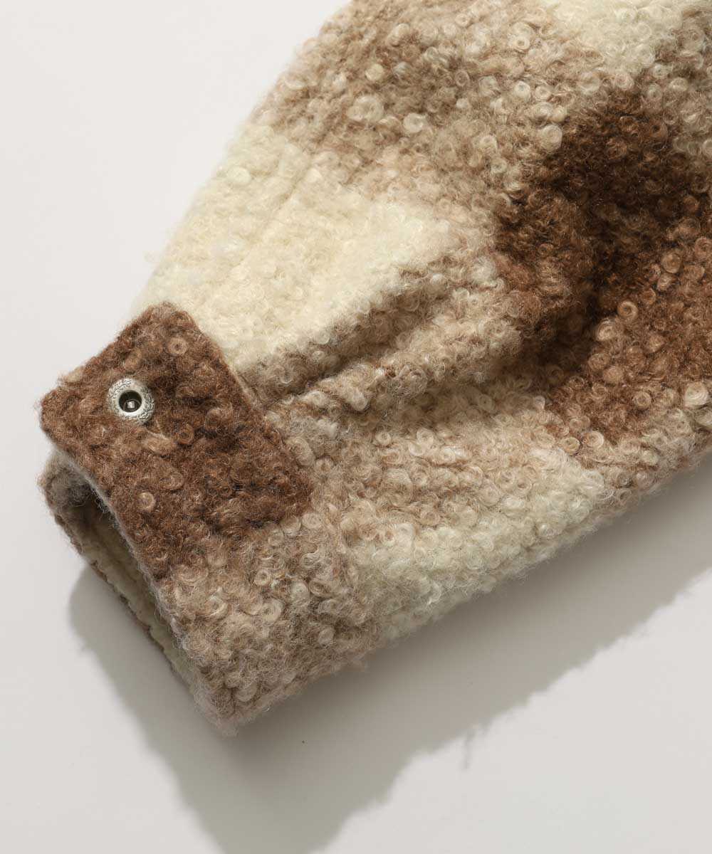 シープスキンジャケットのようなディテールで、高級感にこだわったブルゾン。ウール100%のボアは文句なしの暖かさで、甘く見えないように、裾にアクセントとしてディアスキンの革紐をあしらっているのもポイント。絶妙なグレートーンの1着で差がつくこと請け合い。