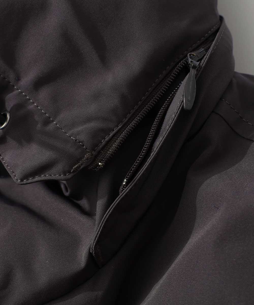 高級感あるマットな質感のボディに、ニットの袖をドッキングしたコンビブルゾン。なんとこの薄さでボディにはダウンが入っているという驚きの仕上がり。便利な両胸ポケや取り外し可能なフードなど見どころが盛りだくさん。重すぎない絶妙なダークグレーのカラーや、そのボディカラーに合わせてジップなど細部までシックにまとめている。