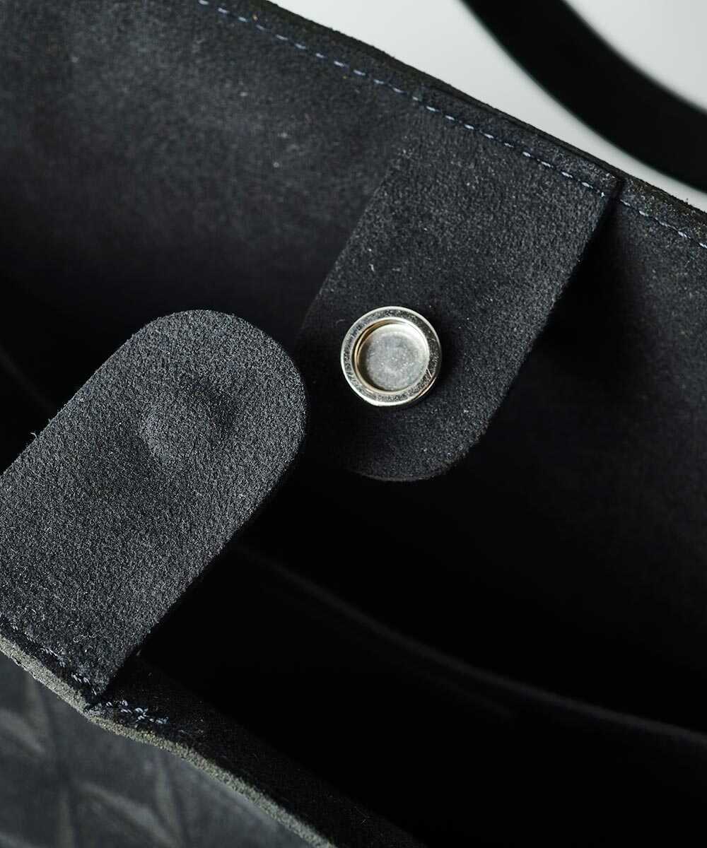 レーザー加工で施した高級感あるモノグラムの柄を生かすため、過度な装飾は省いたミニマムな作り。とはいえ、必要な要素はしっかりと備えており、開口部はスナップボタンで固定でき、内ポケットも備えている。