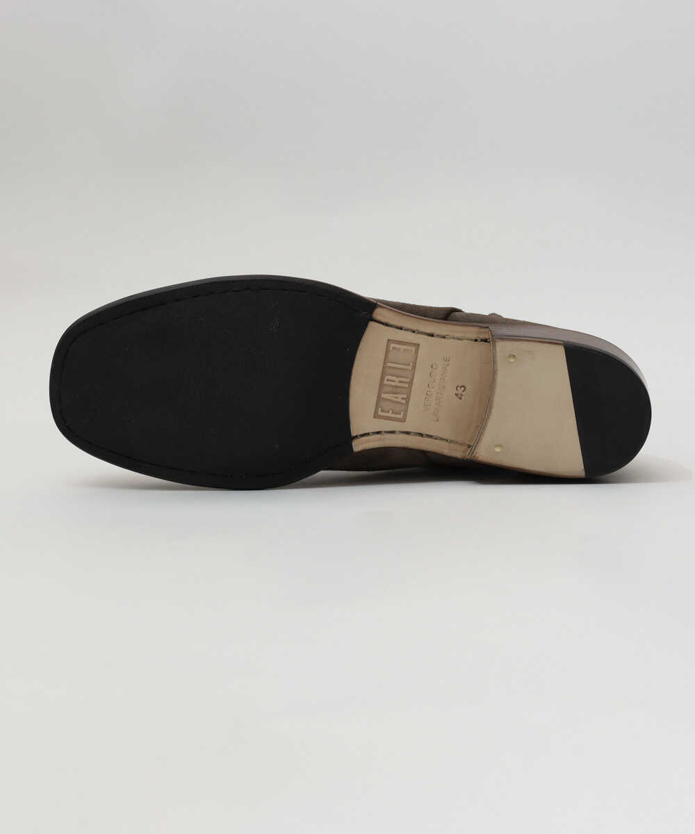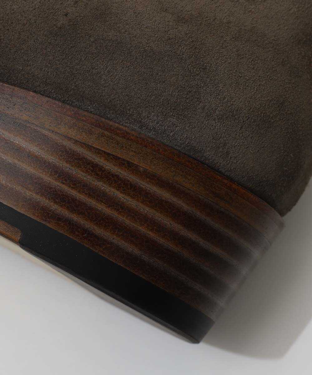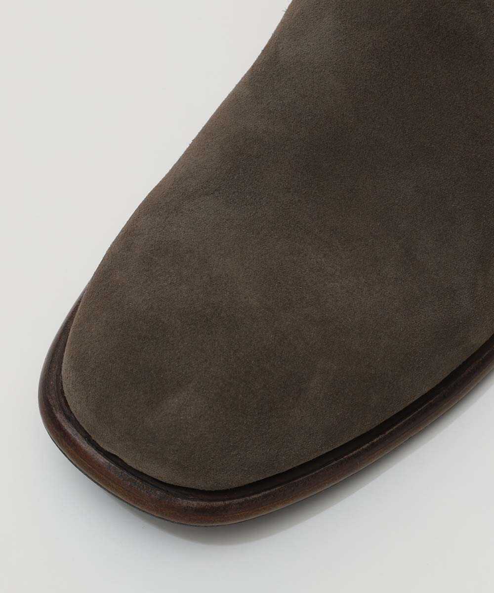 スラっとしたフォルムとやや高めの4㎝ヒールに設定したヒールで上品な表情に仕上げたショートブーツ。やっぱりここぞというときはレザーシューズの出番。この1足は、『Safari Lounge』別注の毛足が美しいイタリア産のグレージュオイルスウェードレザーをアッパーに採用。さらに完成後にイタリア「KENDA FARBEN社」のワックス剤を塗布し、よりレザー表面に深みのある表情を加えるとともに汚れにも強い仕上げになっている。