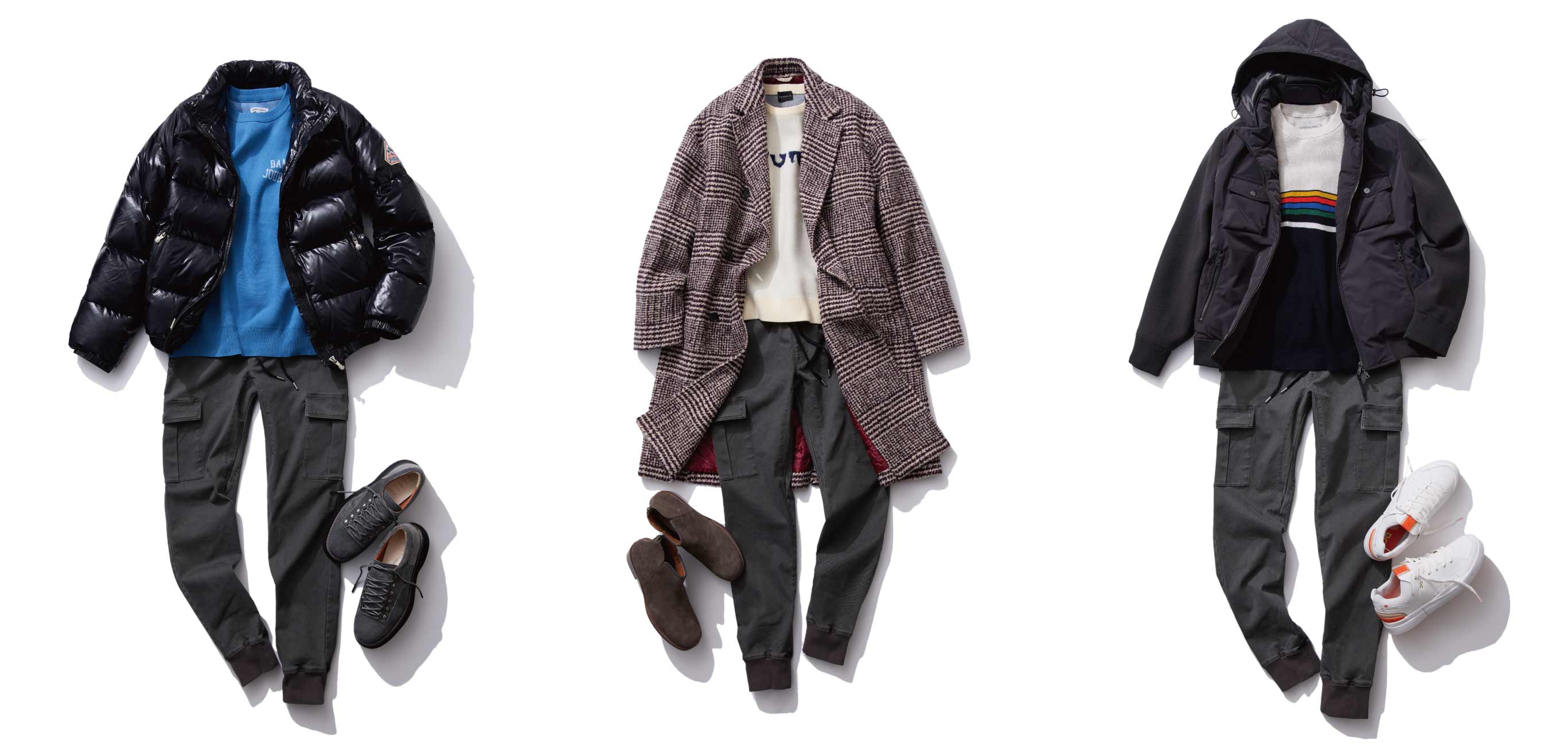 お次はロング丈のコートとのスタイリング。上品さを出せ、着こなしを一気に格上げできる1着だが、合わせるアイテムも上品なものを選んでしまうとコンサバ見えしてしまうのが悩み。そんなときのカジュアルダウンに使えるのがこのイージーカーゴパンツ。タフな生地感とカーゴポケットで、さりげなく男らしさを出せ、裾のリブで軽快さも加えられるのが嬉しい。細身のシルエットは縦長のコートとも相性ばっちり!