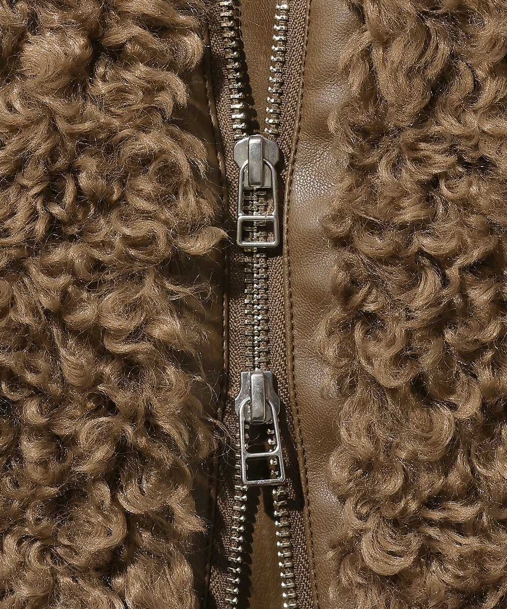 存在感のあるフェイクファーが目を引く〈ラブレス〉のジップアップブルゾン。可愛くなりすぎないように、部分使いでシンセティックレザーを採用しているなど細かい部分まで作り込んでいる。襟を大きめにデザインしているので、対比として小顔効果も見込めるのが嬉しい。