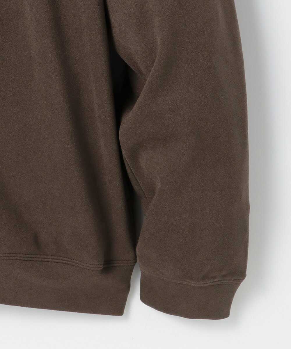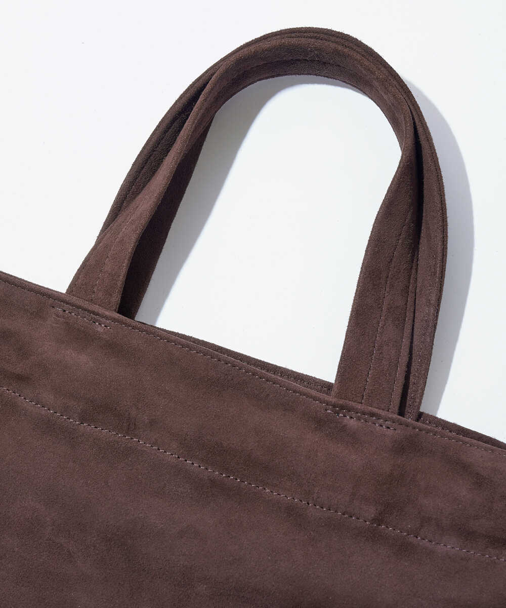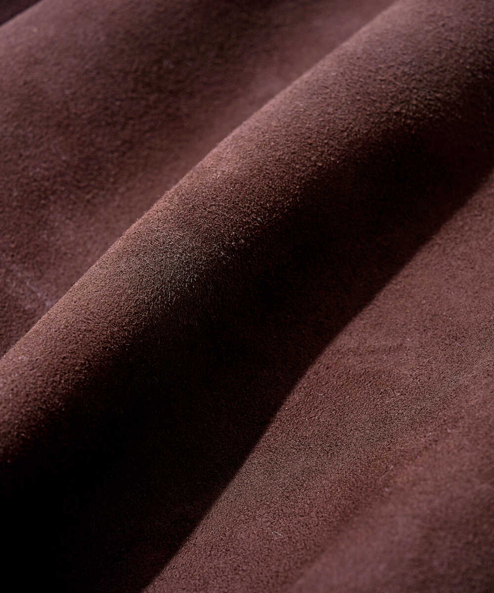 手持ちや肩掛けなどシーンや用途に応じて使い分けが可能なナップサック。シープレザーの上質なスウェードは、インド産の毛が補足、表面が綺麗でしなやかなのが大きな特徴。また生産の工程で使用する水も浄水施設を工場内に設置し飲んでも害のないレベルに合わせることで、美しい発色の革を実現し、手作業のサンドペーパー加工でクリアな質感に仕上げている。