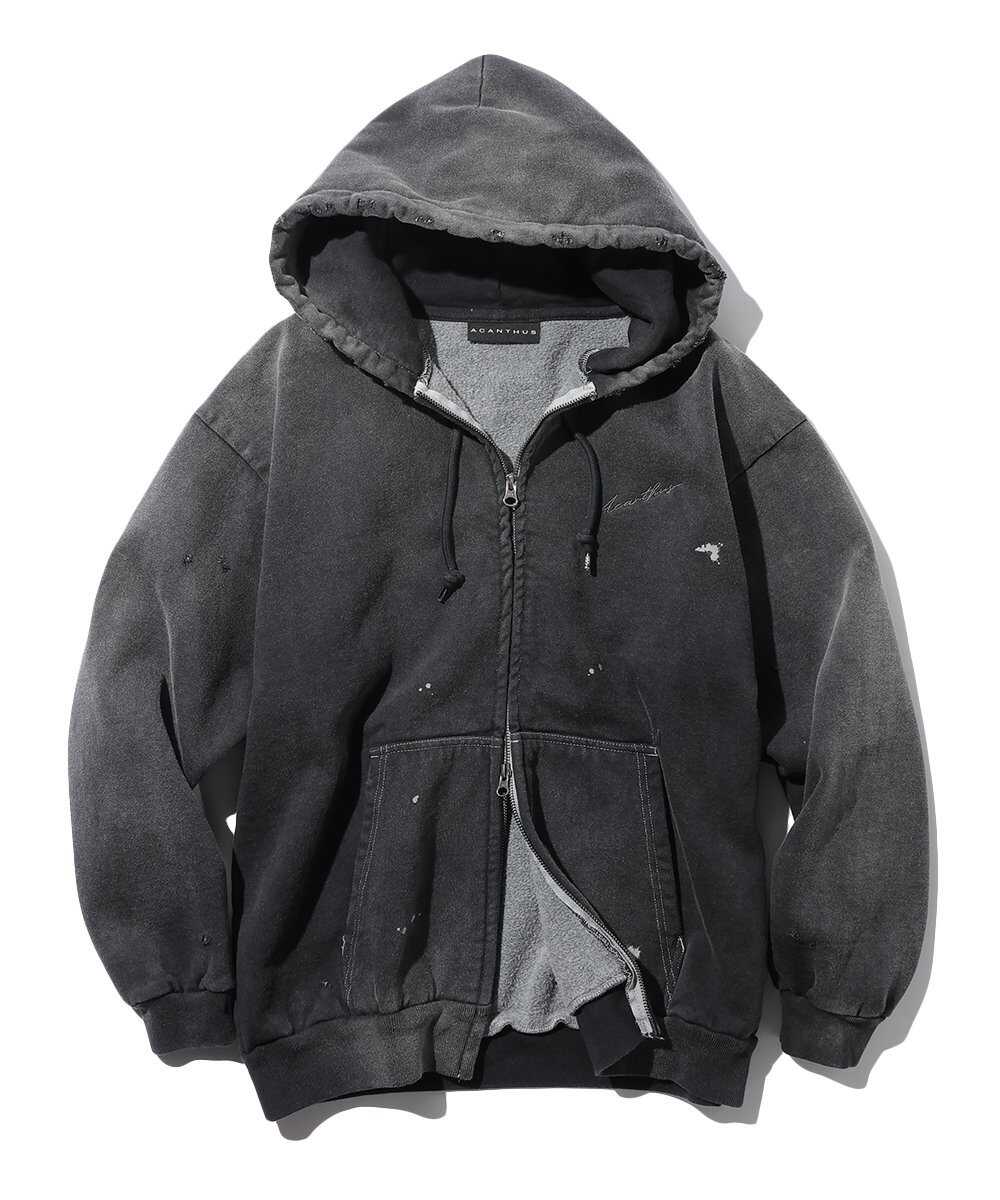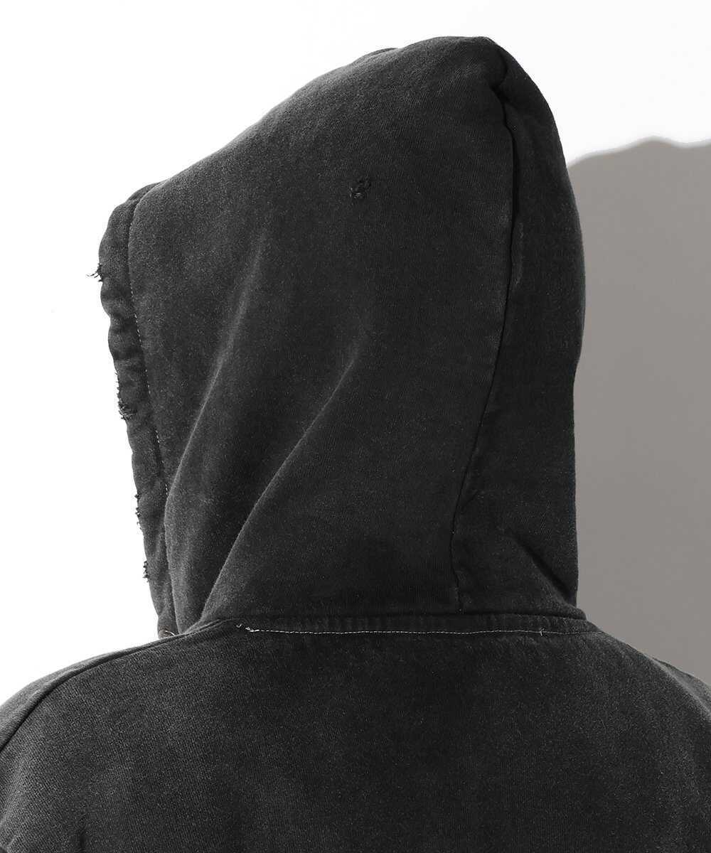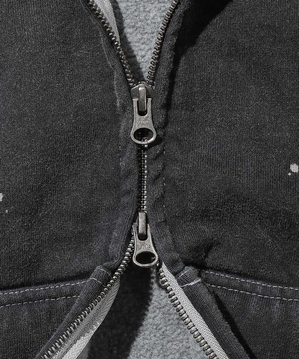 ヴィンテージのような味わい深い表情のパーカは、製品硫化染めで染め上げた後に、スプレーブリーチ、サンフェード、ダメージ加工など数々の工程を経て、リアルな経年変化を表現。厚手で裏起毛のスウェット生地は、アメリカンオーセンティックを体現している。