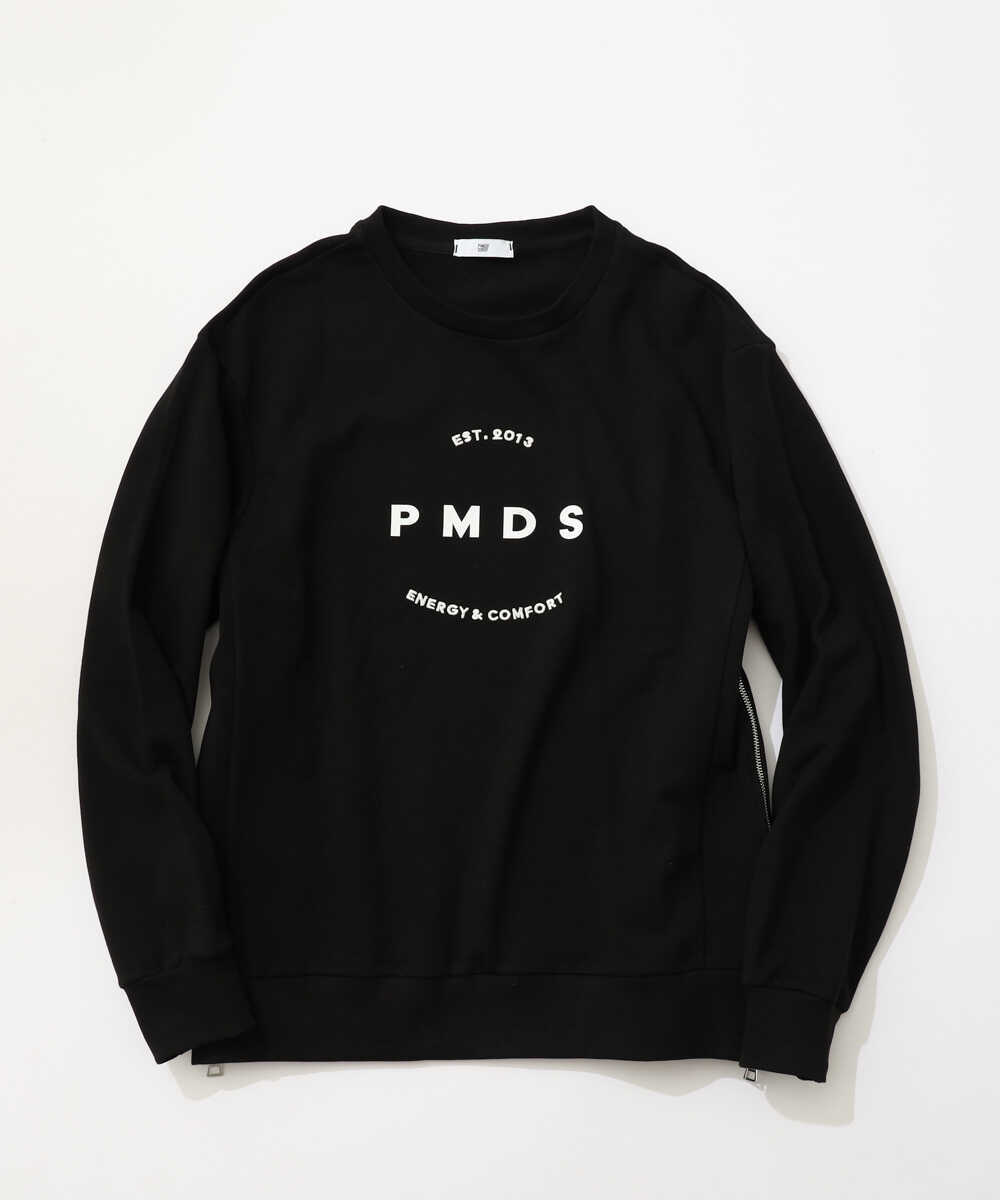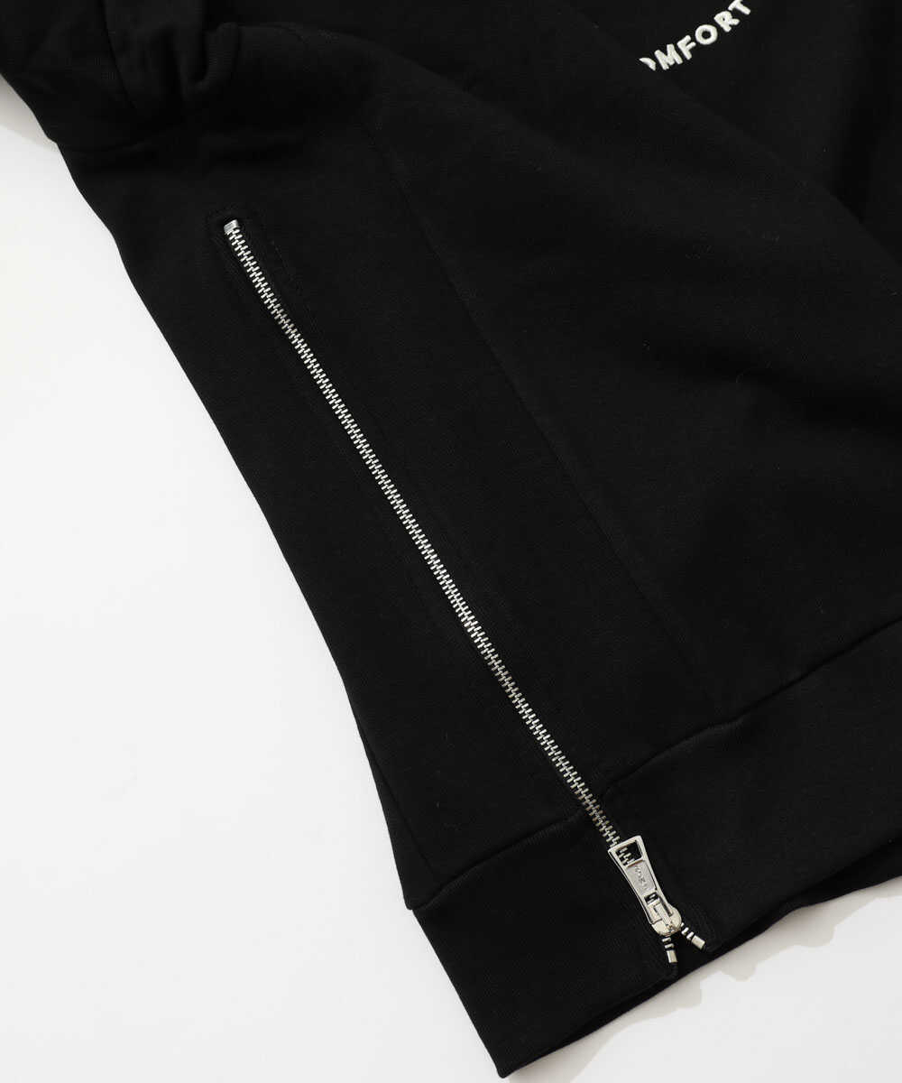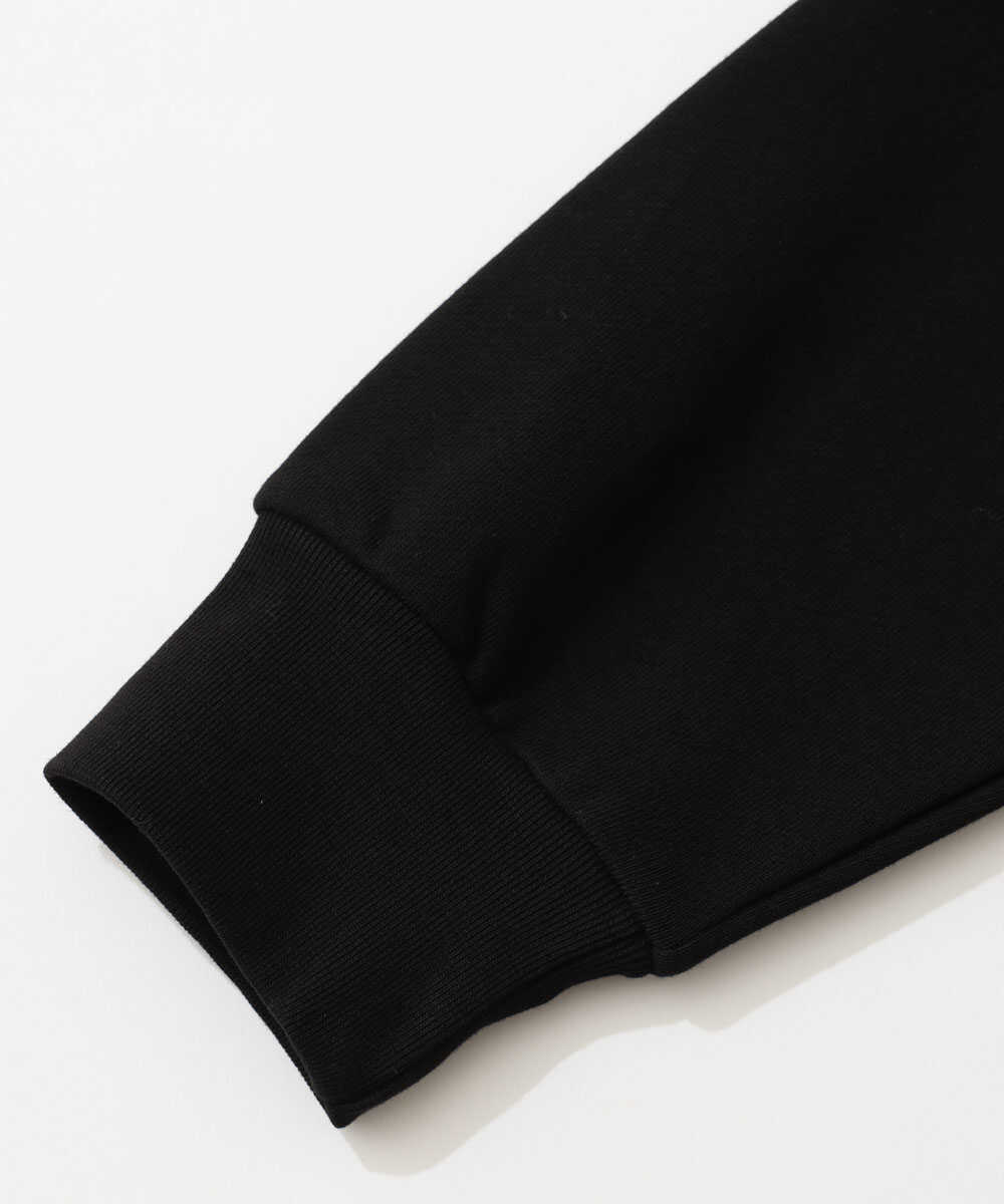 両脇にジップがあり、開けて左右の裾を開くことで、レイヤードに変化をつけられるスウェットシャツ。フロントには黒ボディに映える、アイキャッチになるロゴグラフィックも。これ1枚加えるだけでレイヤード上級者になれるのは間違いなし!