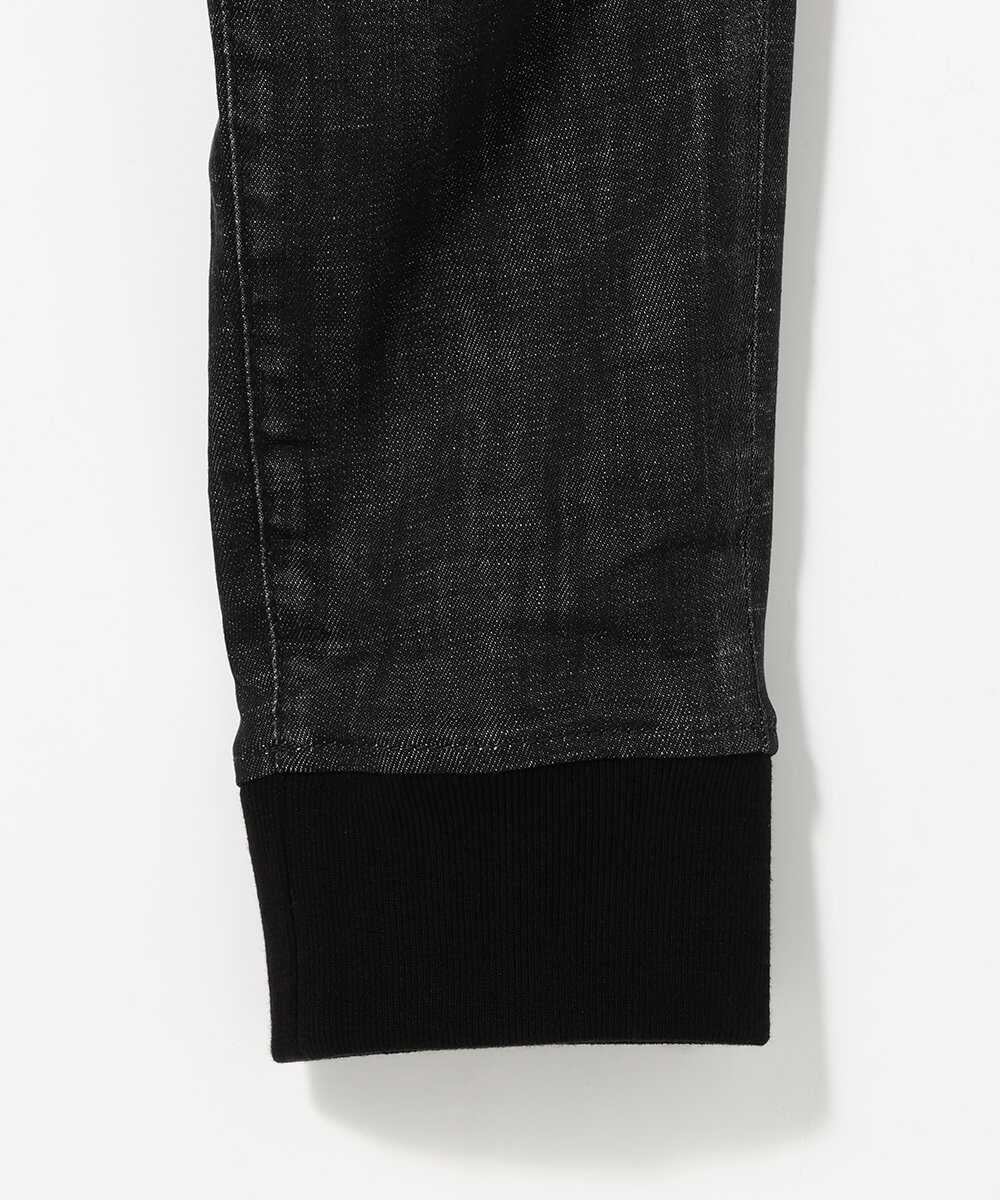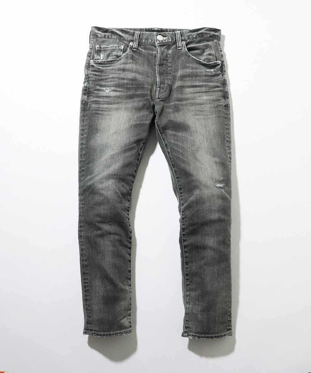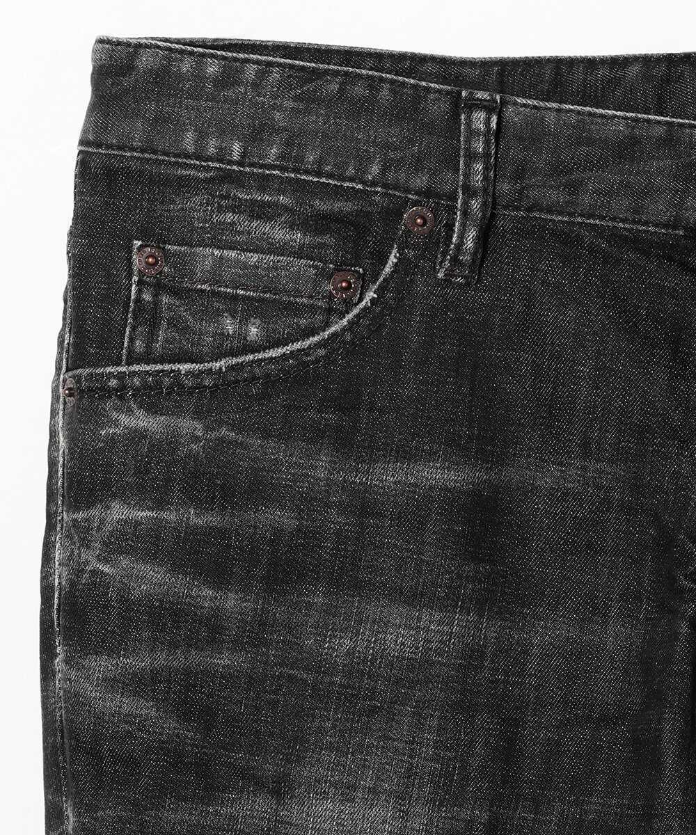 柔らかな生地感のプレミアムコットンを採用し、腰や腿まわりにややゆとりを持たせつつテイパードシルエットに仕上げた1本。なんと、10オンスのブラックデニムにオーバーダイを施し、さらに深みのある表情に仕上げている。さりげなく手作業でヒゲなどの加工を施しているのも見逃せない。