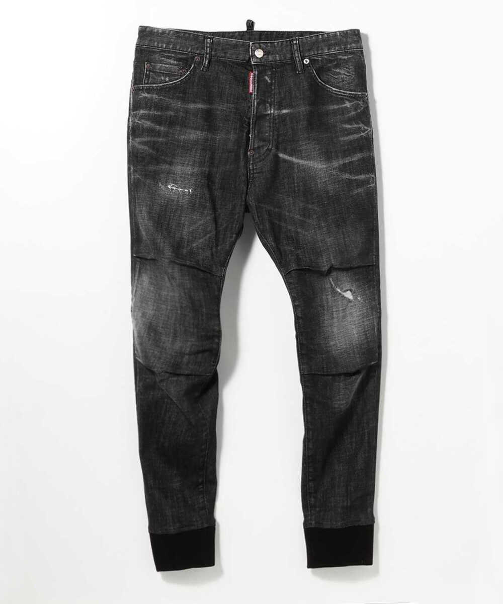 裾がリブになったジョガータイプの1本は、〈ディースクエアード〉のデニムの中でも珍しい1本。膝の上下にはさりげなくダーツを入れて、美しいテイパードラインが際立つようにデザインされているなど、さすがラグジュアリーデニムを牽引する作り込み。