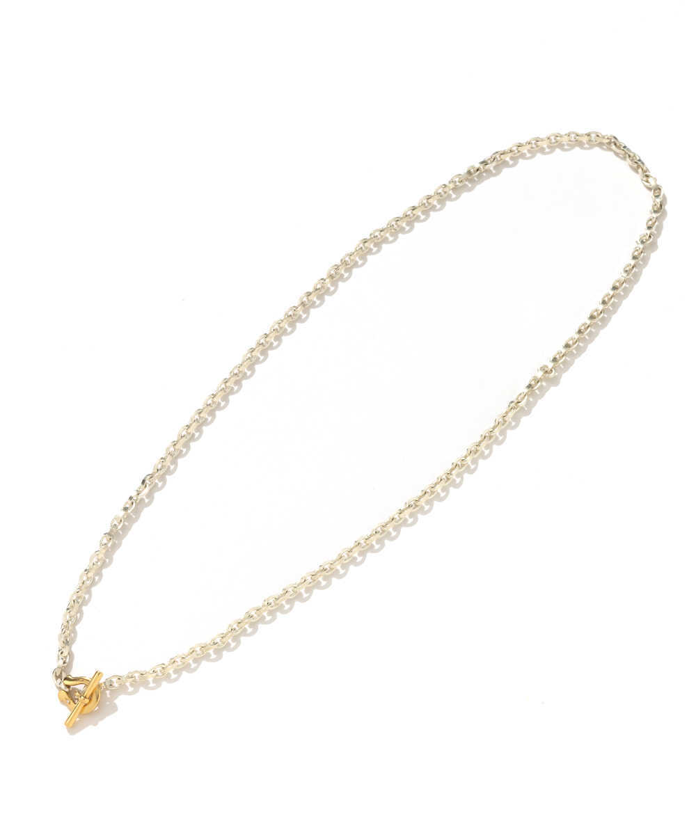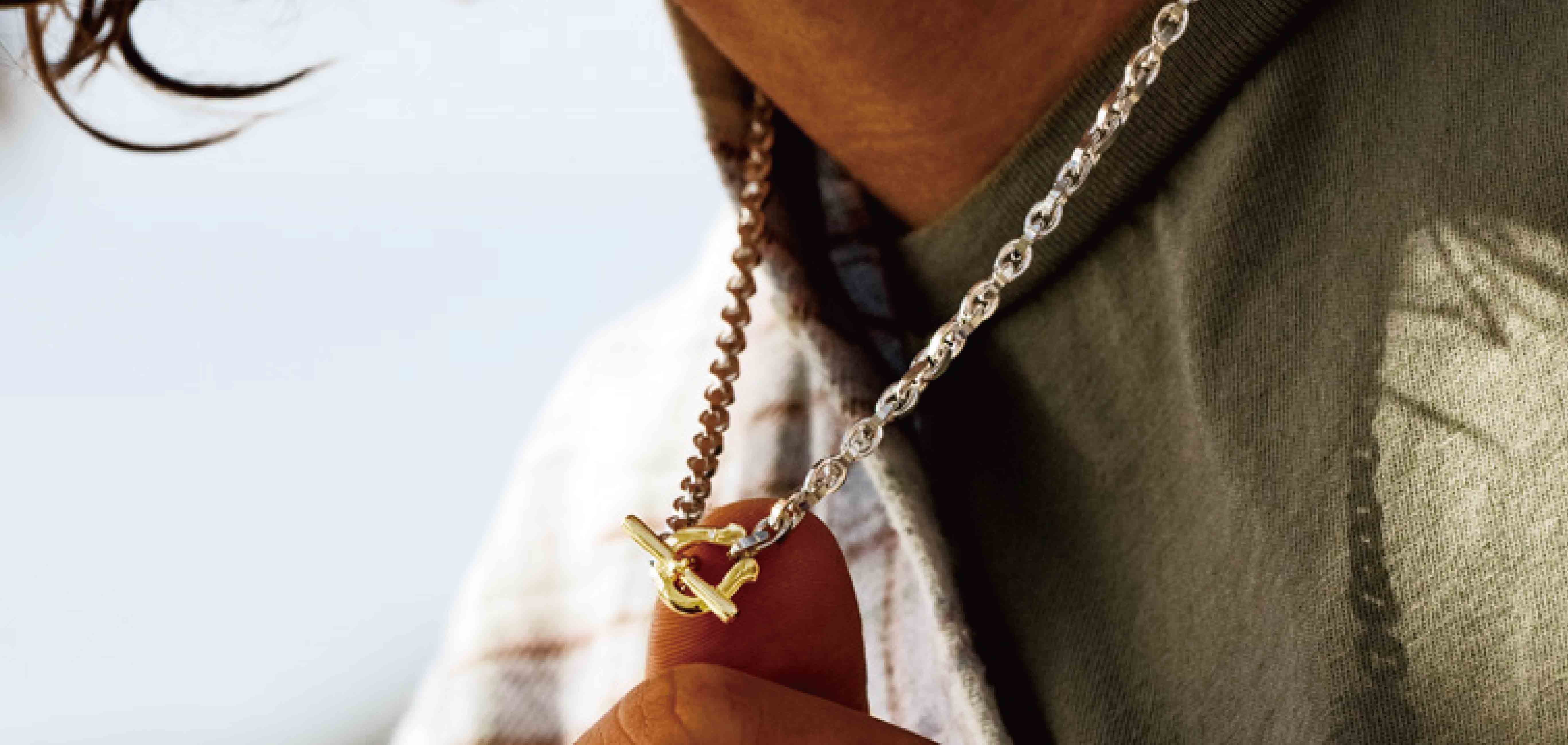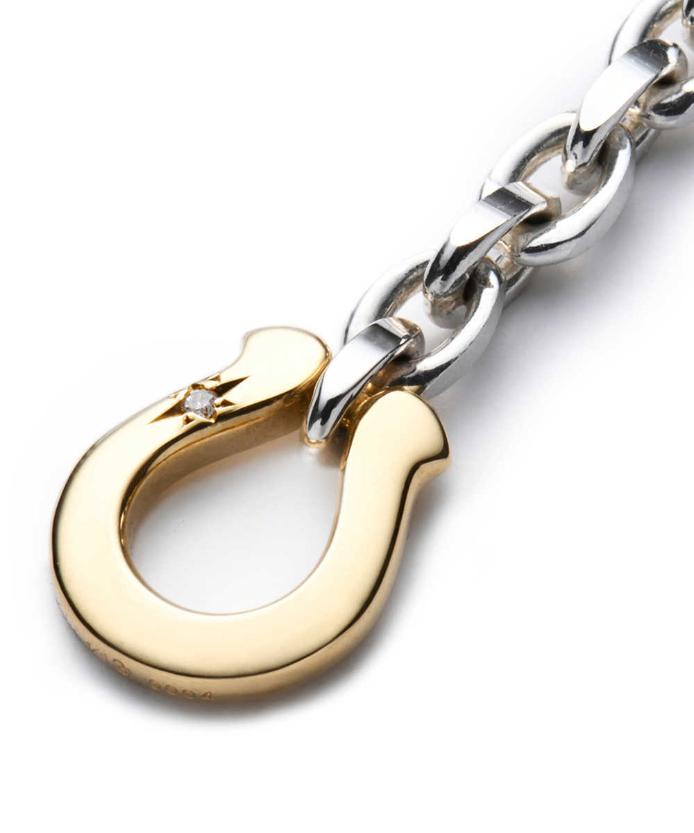 クリーンなシルバーチェーンと、1粒のダイヤモンドがセットされた18KYGホースシューを組み合わせたネックレス。細身のチェーンでこれみよがしに見えず、ひとつずつのコマが繊細すぎないフォルムなので、男らしさも演出できる。そして注目はなんといってもホースシューのモチーフ。あえてこの部分だけゴールドを採用することで、シルバーとのコントラストが生まれアイキャッチに。煌びやかなダイヤモンドの輝きが大人にふさわしいデザインだ。