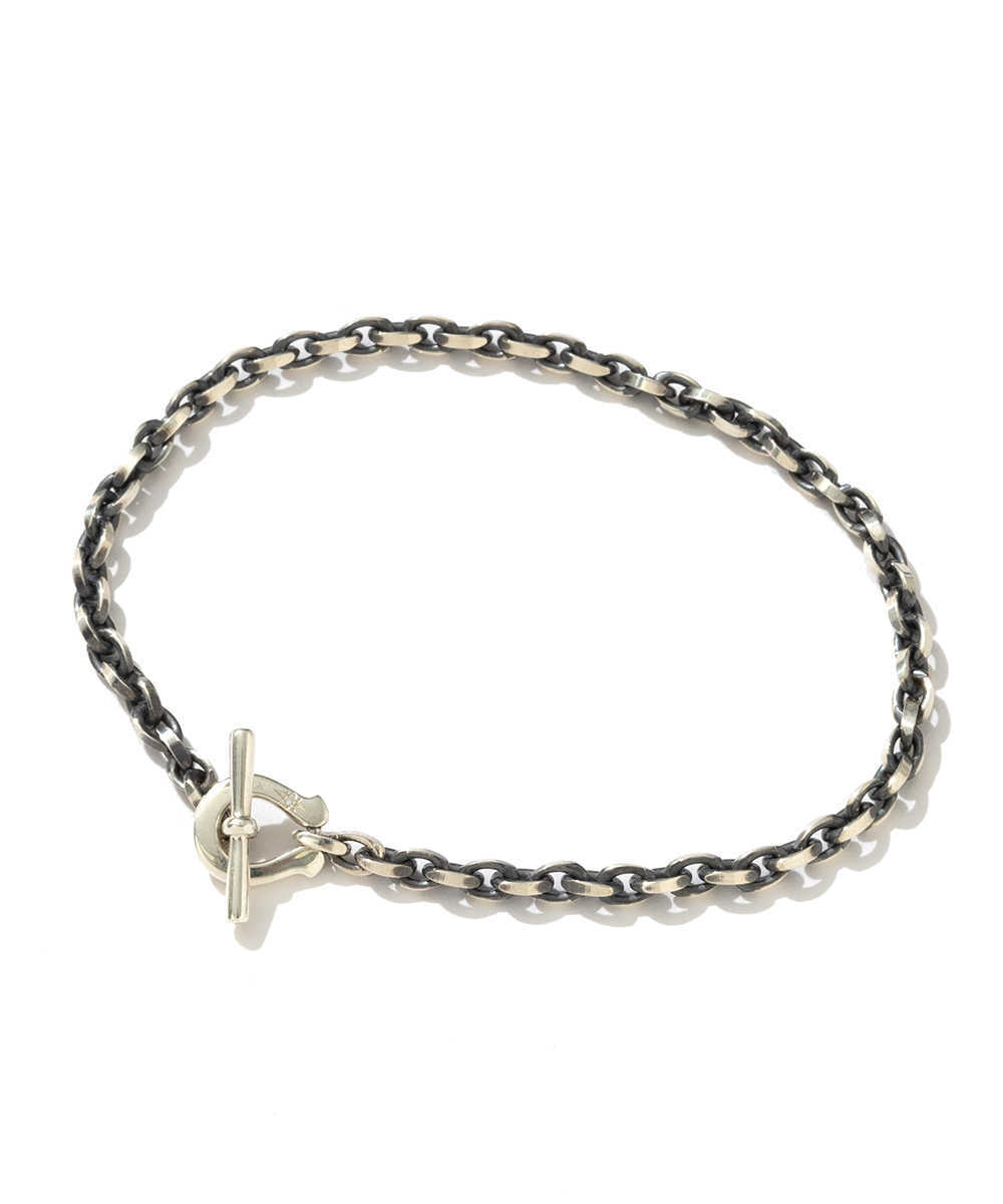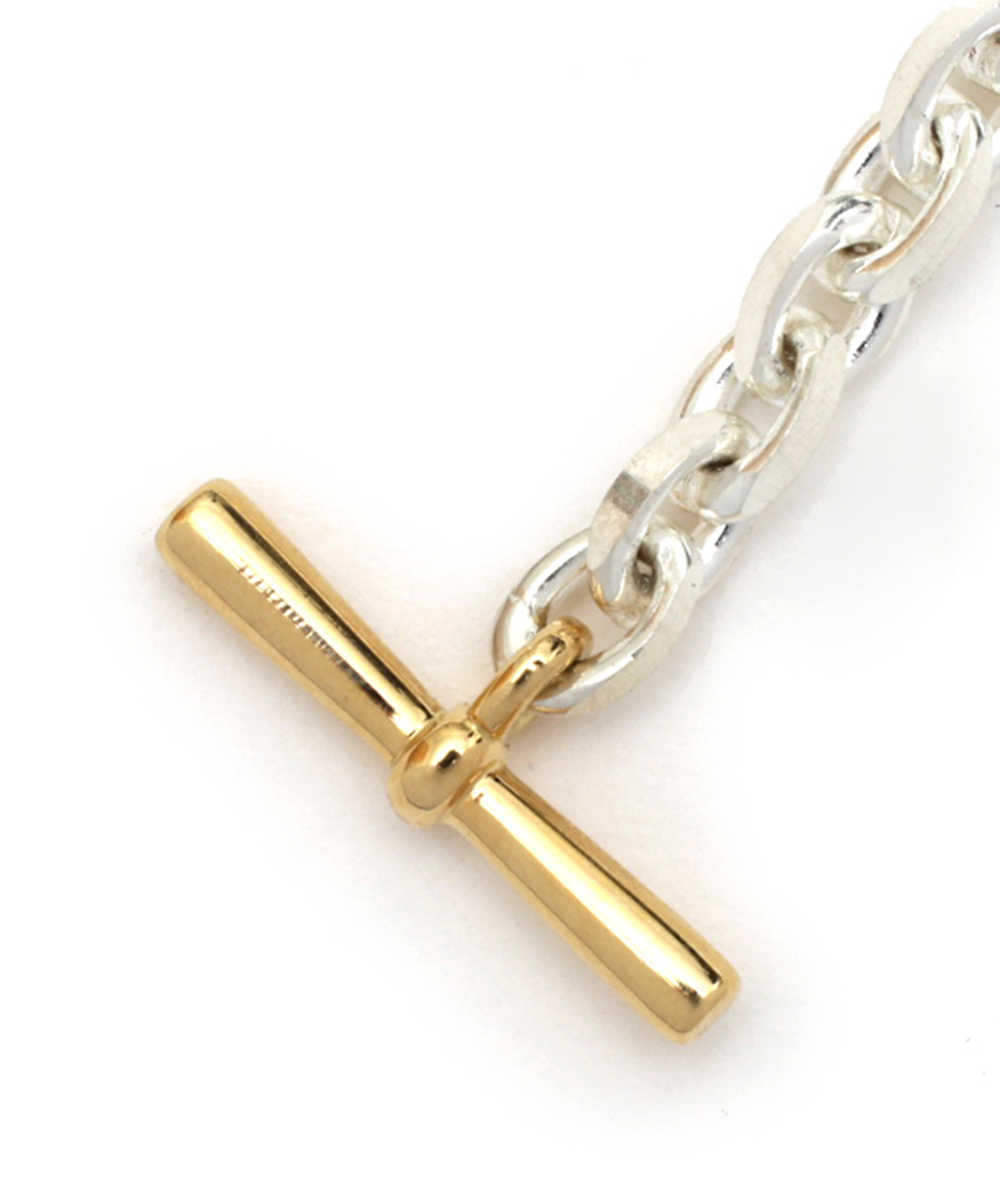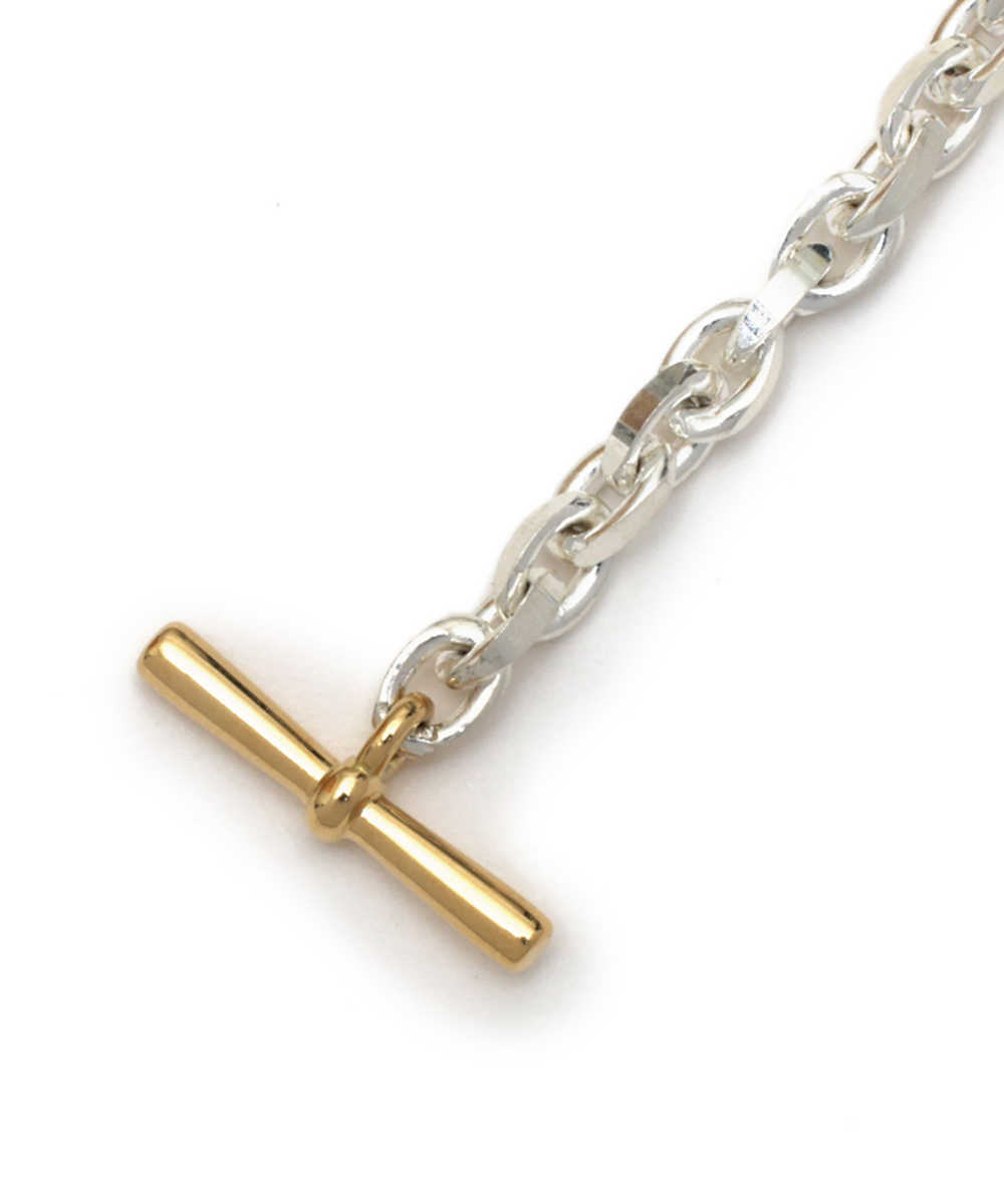 先ほど紹介したネックレスと同じデザインで、ブレスレットに仕立てたのがこちら。より気軽に取り入れられるし、手元の動きに応じて輝きが変わる流動性を持たせられる。細身のチェーンなので、腕時計と重ねて身につけるのもおすすめだ。