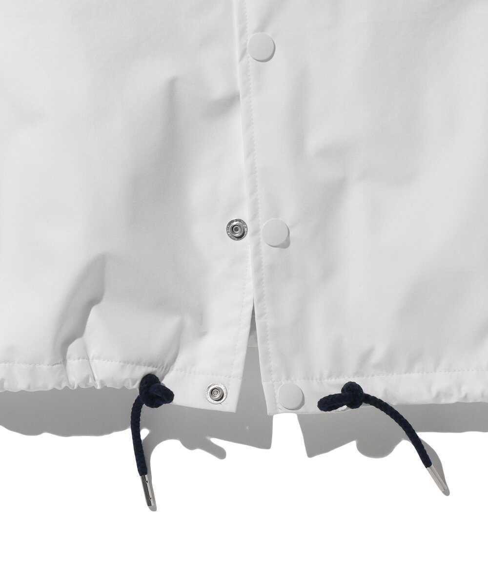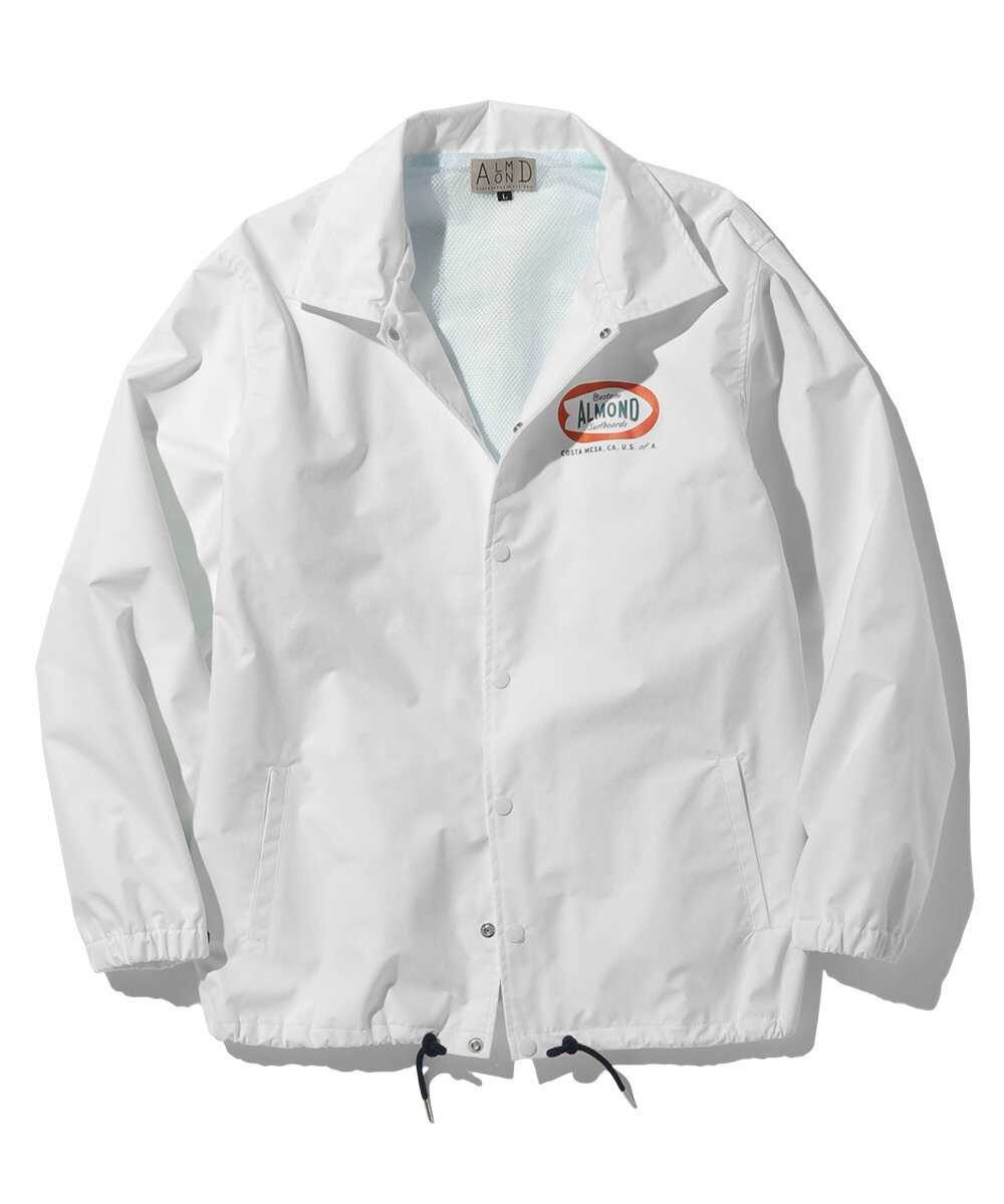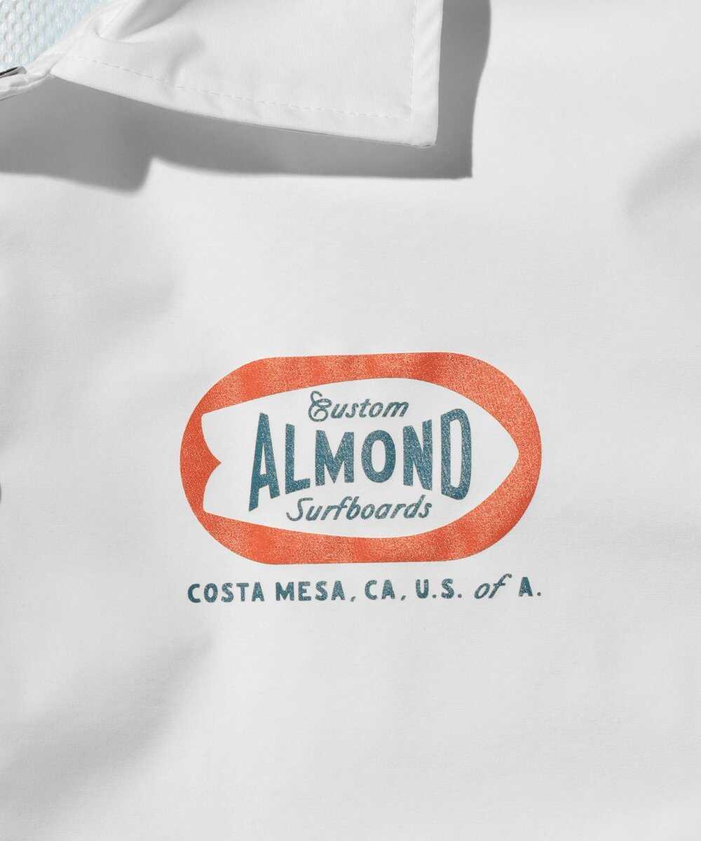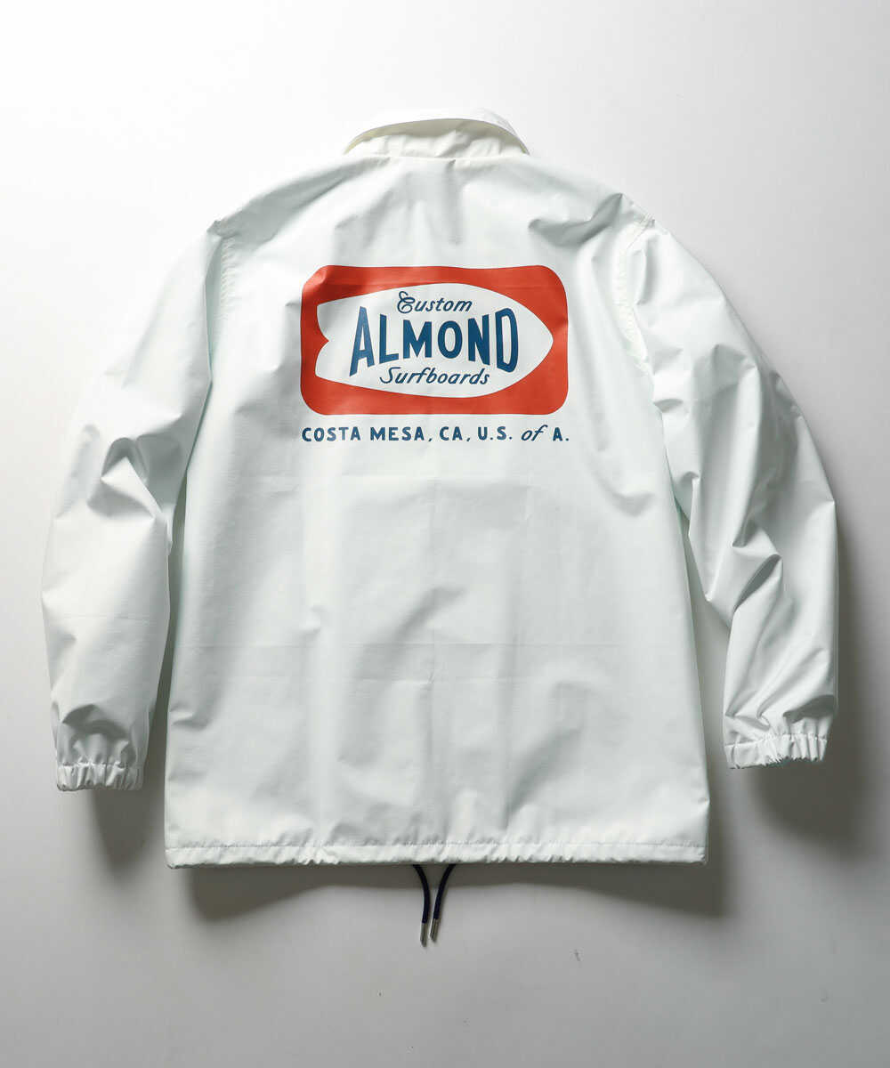 ネオクラシックスタイルのサーフショップとして、2007年に創業した〈アーモンド〉に別注して製作したコーチジャケットは、防水透湿素材の"ブリザテック"をボディに採用。雨風をシャットアウトし、蒸れを軽減してくれる優れた1着で、まばゆいホワイトが清潔感たっぷり。かつての店看板を思わせるグラフィックを胸と背中にオンして、抜け感ある気持ちのよい仕上がり。