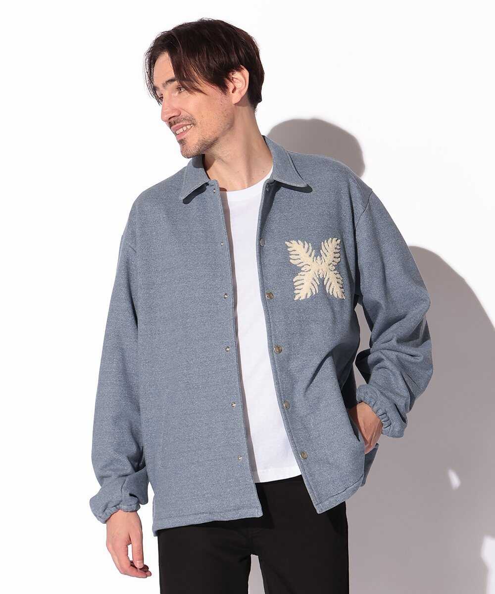 回収したデニムとリサイクルコットンで製作した絶妙な色味が持ち味のコーチジャケット。ナイロン素材が多いこの手のアイテムでは珍しいスウェットライクな仕上がり。胸元には、ハワイで祝いごとや装飾に使われる伝統植物「ラウアエ」をモチーフとしたサガラ刺繍を配置し、ブランドのルーツを表現。