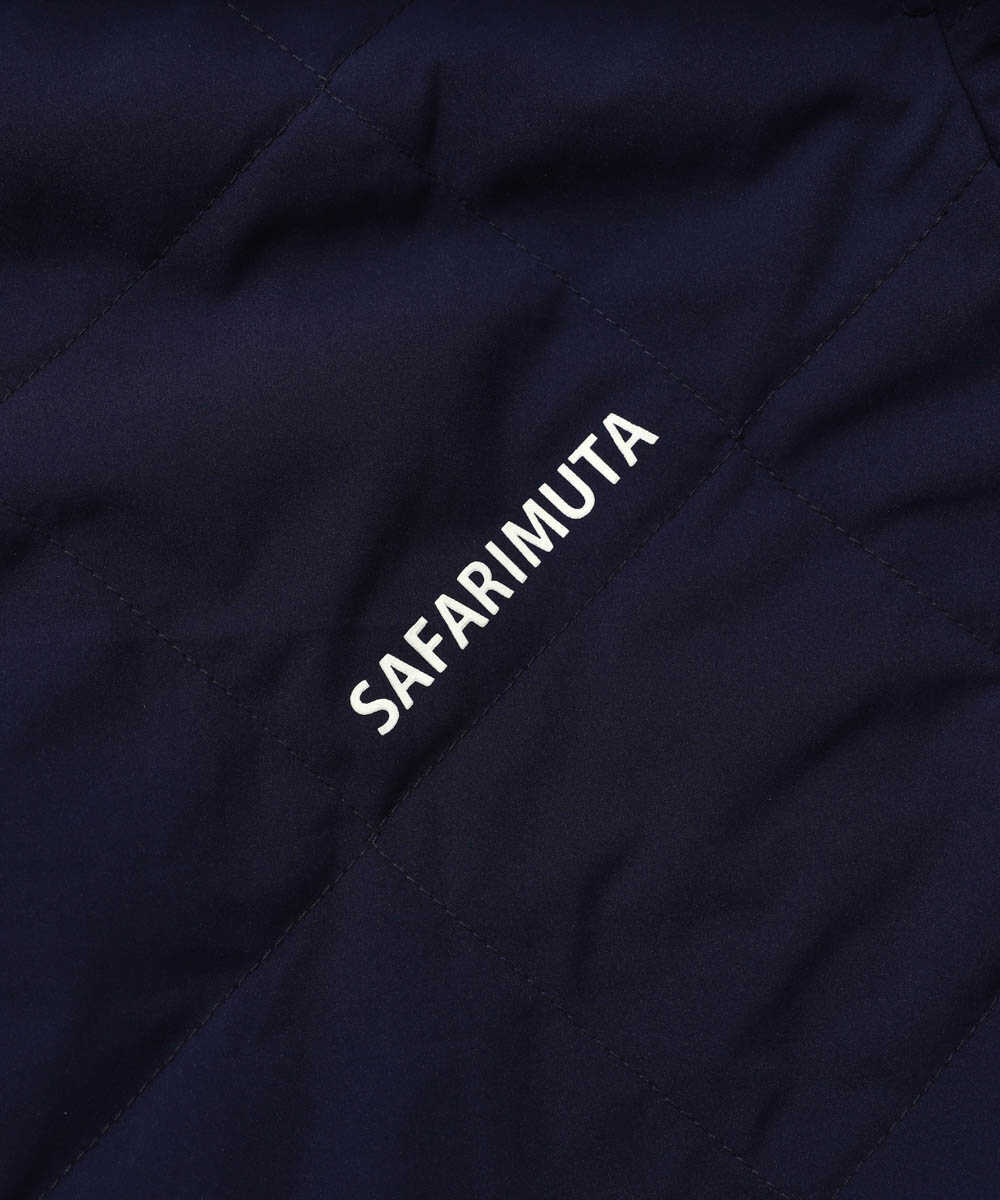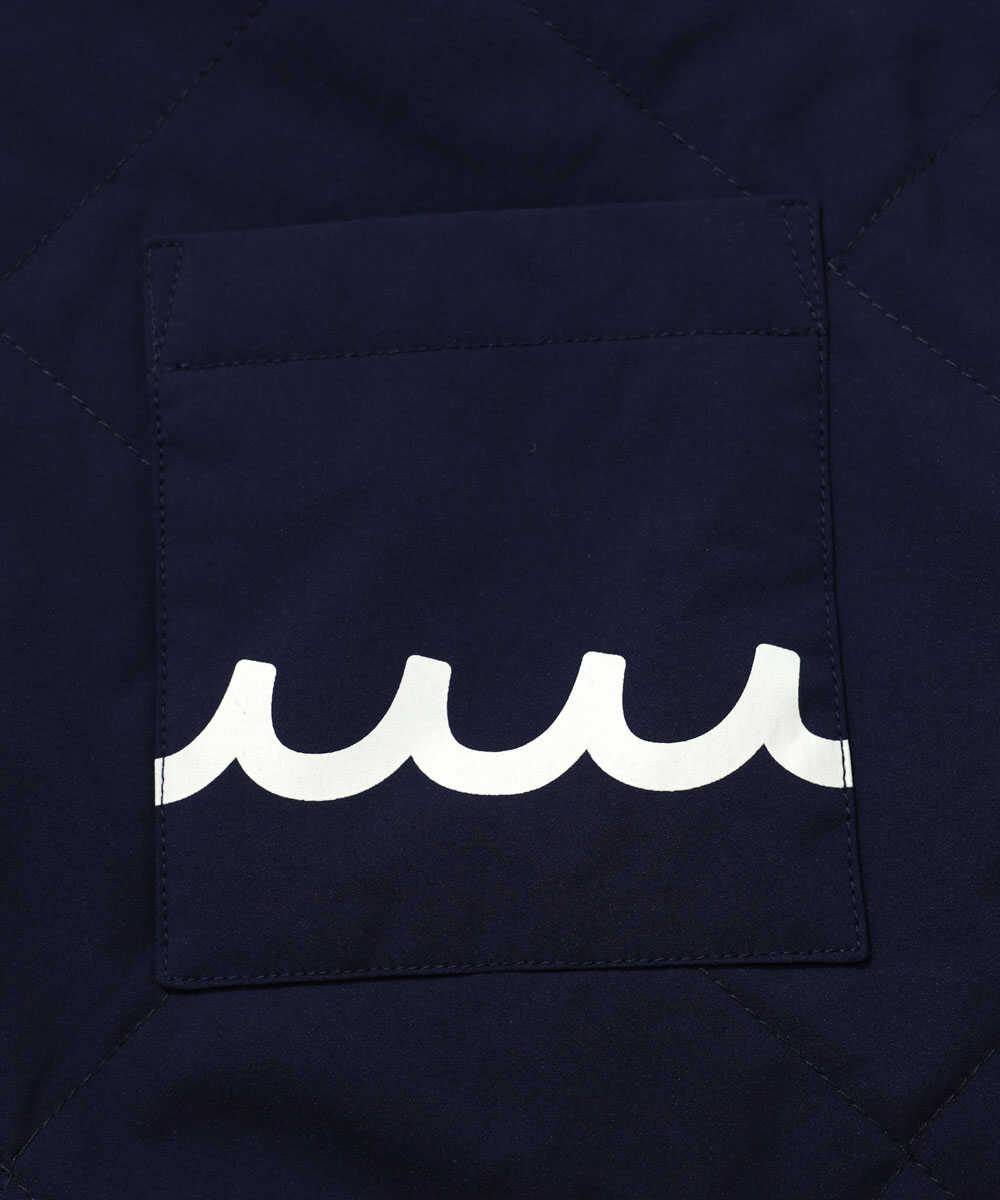 深みのあるネイビーが大人の雰囲気を演出するコーチジャケット。ボリュームが出すぎない、絶妙なさじ加減で中綿を入れているので、春先の寒さにも対応できる。バックにはさりげなくコラボの証しとしてロゴをオン。胸ポケに描いた波模様やストライプ襟の切り替えで、ストリート感が出過ぎず、海好きアピールも叶う。