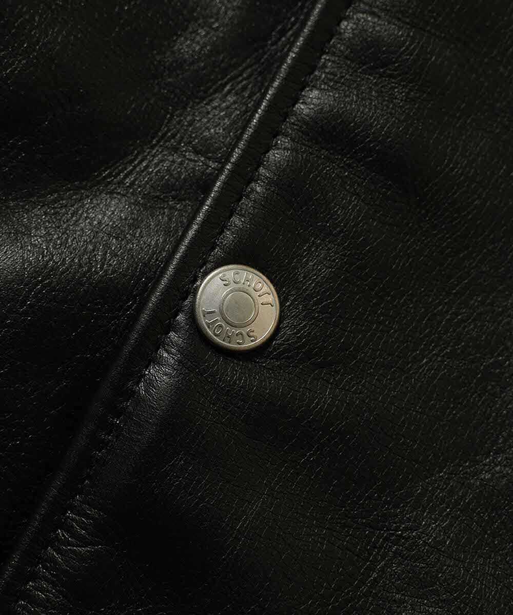 しなやかで耐久性に富む、クロームなめしのカウレザー仕立て。ゴム入りの袖口や裾まわりのドローコードといったならではの意匠はそのままで、スナップボタンは黒革に映えるマットなメタル製にすることで高級感もばっちり。育てていきたい1着だ。