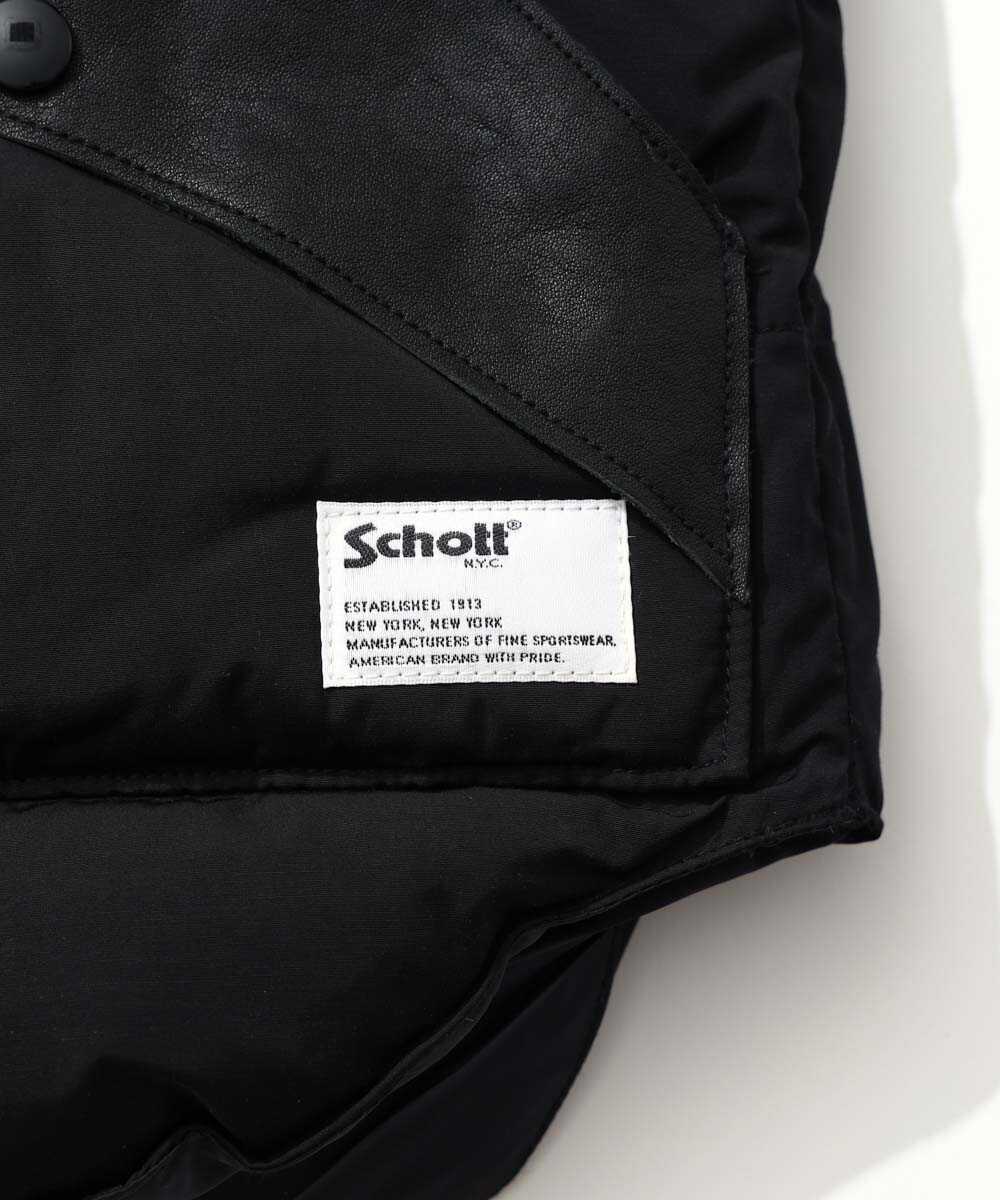 〈ショット〉ファンならずとも見逃せない、知る人ぞ知るレザーコンビのベストが復刻。肩ヨークとポケットに配されたベジタブルタンニンなめしのカウレザーは、使いこむほどに自分だけの味わいへと変化する仕上がりで、中綿にはダウンとフェザーを贅沢に使用しつつ、4層構造のダウンパックで冷気を遮断。驚くほど軽いのに保温性は抜群。春先のドライブや海散歩の最強の相棒になること間違いなしだ。