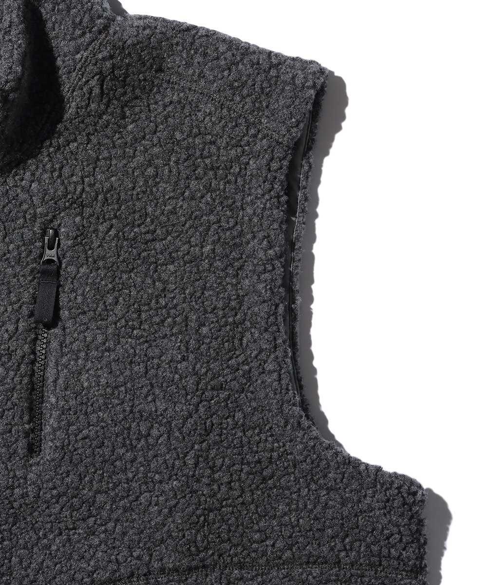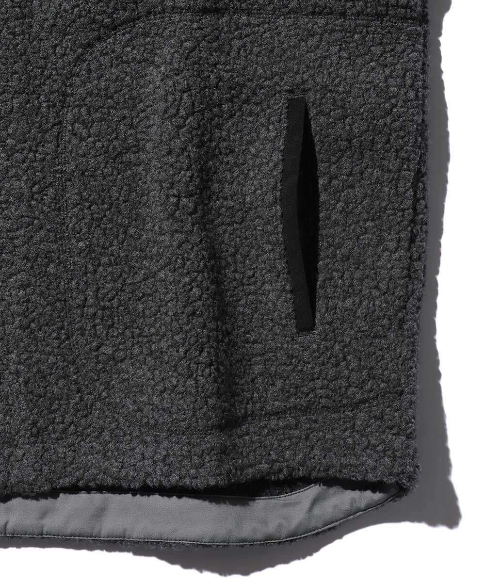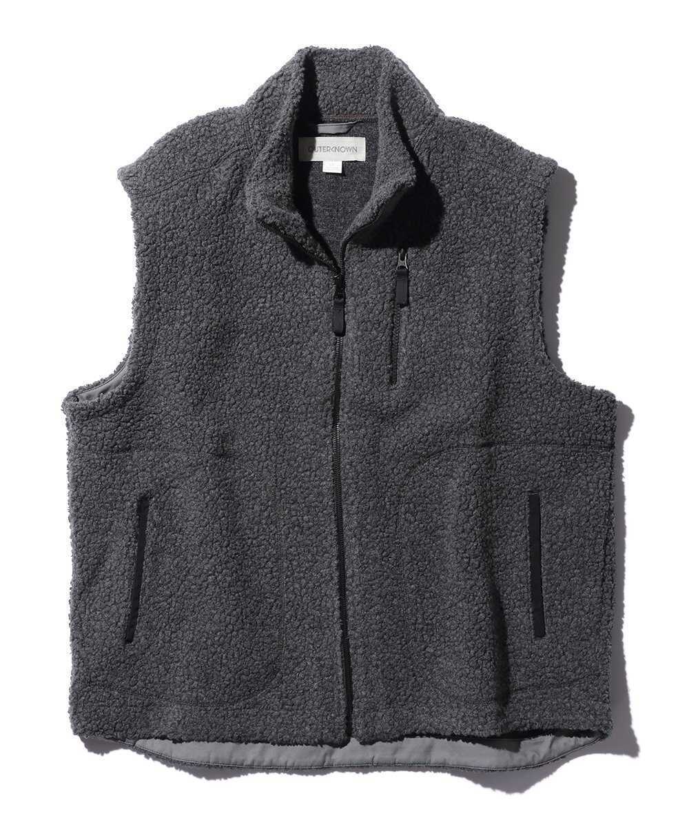 リサイクルウール100%にこだわった、サステナブルなボアベスト。イタリアの老舗"マンテコ"社の生地を使用し、天然素材ならではの柔らかな質感と高い通気性を実現している。ポリエステル製のフリースとは一線を画す、ウール本来のぬくもりとグレイッシュなカラーが、大人の休日に品格を添えてくれる。蒸れにくいので、気温が上がる日中も快適な着心地をキープできるのが魅力だ。