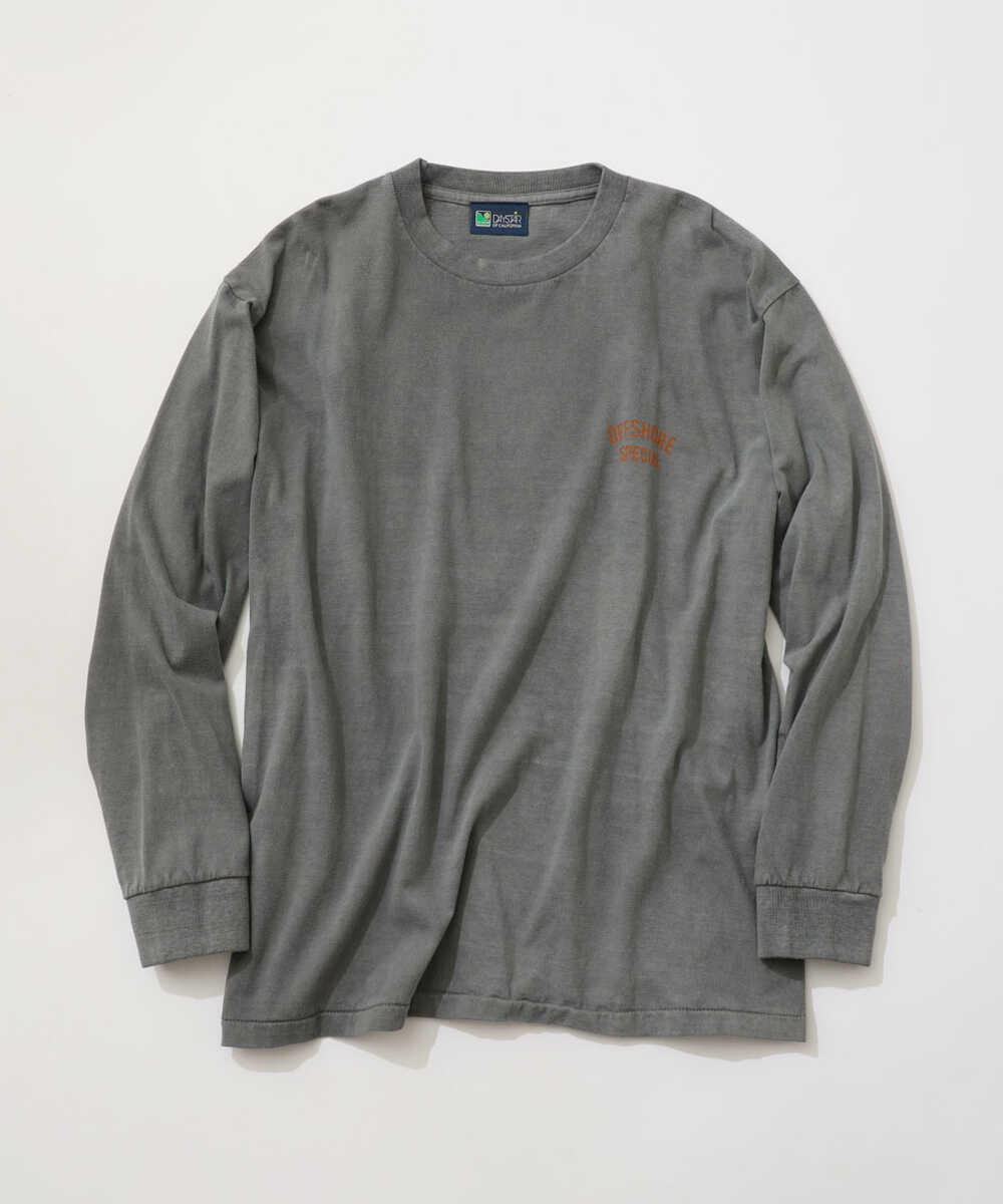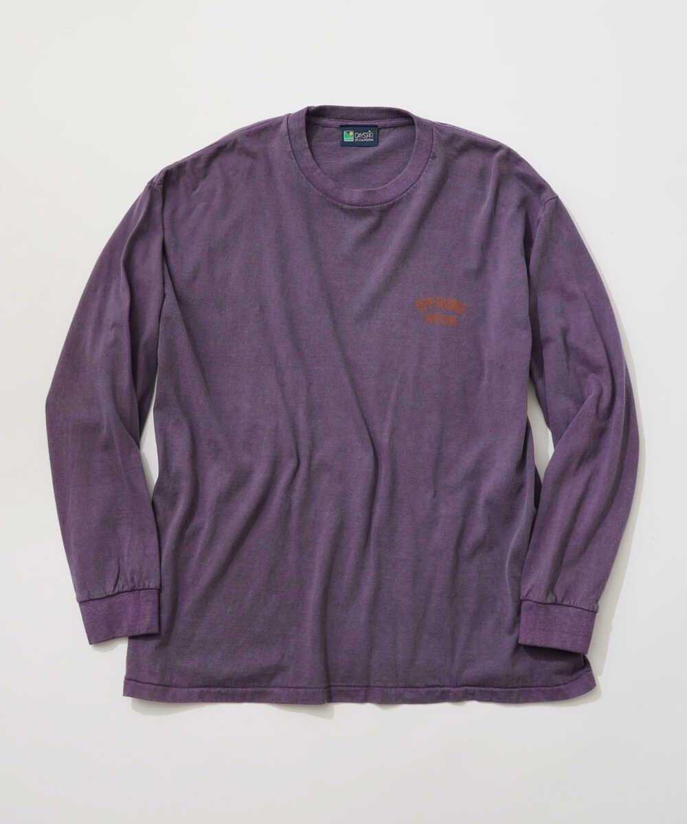 胸元のさりげない椰子の木と、背中の力強いメッセージ。ヘビーウエイトな生地感は、ガシガシ洗って味を出したくなるタフな仕上がりだ。別注ならではのカラーリングは、アーバンな装いにも馴染むクリーンな佇まいが魅力。