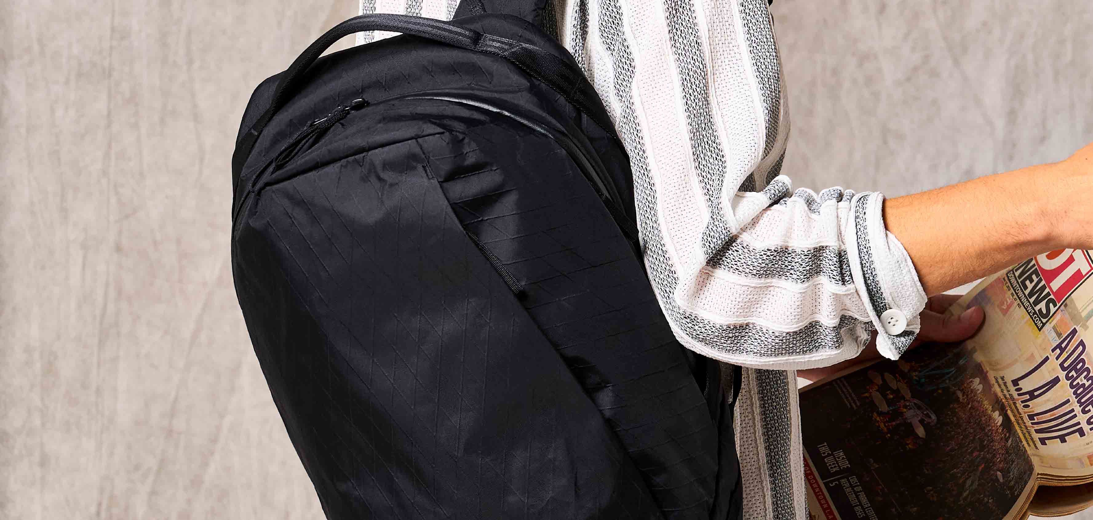 まずは、このコンパクトな“サーティンデイバッグ”に注目してほしい。13Lという絶妙なサイズ感は、混雑した電車内やスマートに移動したい都会のビジネスシーンにぴったりだ。ブラックのストイックな佇まいは、ジャケパンスタイルに合わせても品良くまとまる。