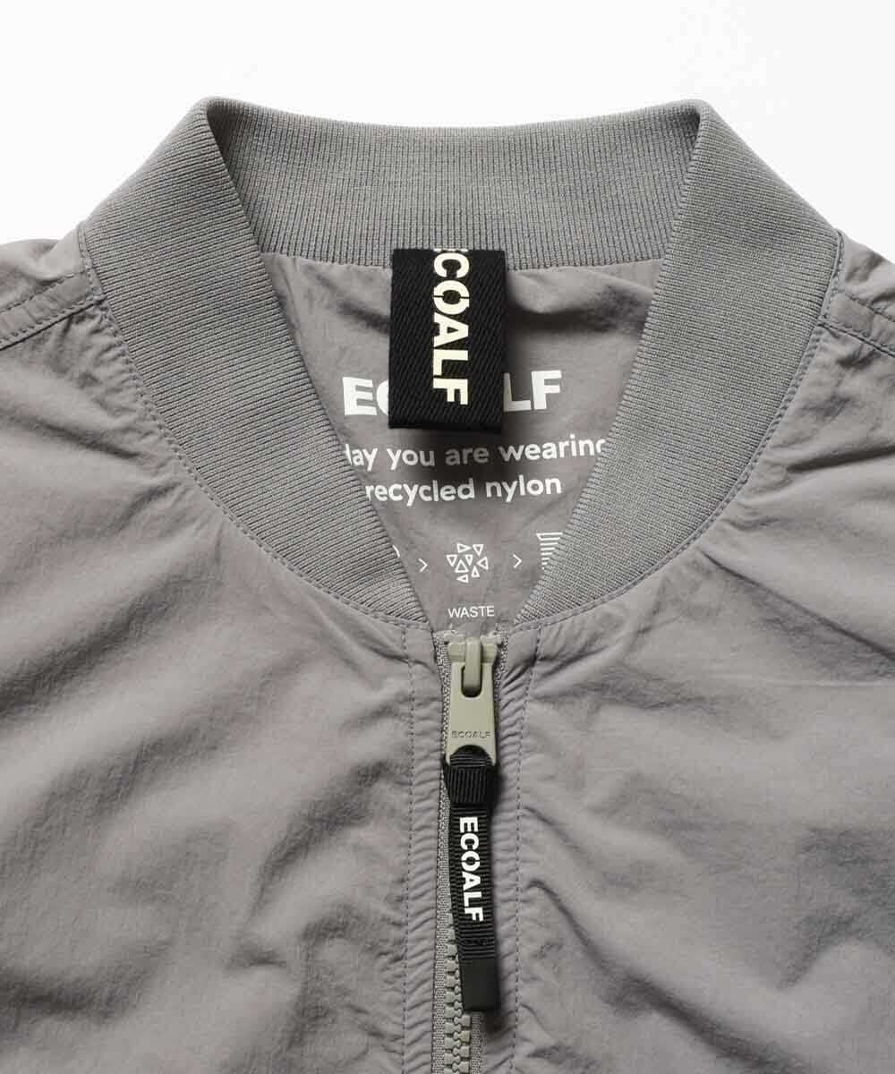 環境先進ブランド〈エコアルフ〉が手掛けるMA-1は、ミリタリー特有の土臭さを一切排除したクリーンな一着。リサイクルナイロンを使用したボディは、驚くほど軽量でいて、高級感のあるマットな光沢を放つ。特筆すべきは、中綿にリサイクルポリエステルを使用している点だ。まだ肌寒い春先でもしっかりと保温性を確保しつつ、ボリュームを抑えた設計により、着膨れすることなくスマートな立ち姿を約束してくれる。