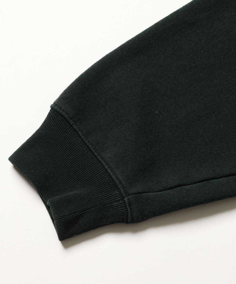 表情豊かなデザインを支えているのは、ほどよい厚みを持たせたコットン100%の裏毛素材。裏地を表に出すことで独特のテクスチャーが生まれ、視覚的にも温かみを感じさせる仕上がりになっている。シーズンを問わず快適に着用できるタフな生地感で、春先の冷たい風からもしっかりと身体を守ってくれるはず。フード部分だけは通常の表地を使用しており、同生地のさりげない切り替えがデザインのアクセントとして機能している。