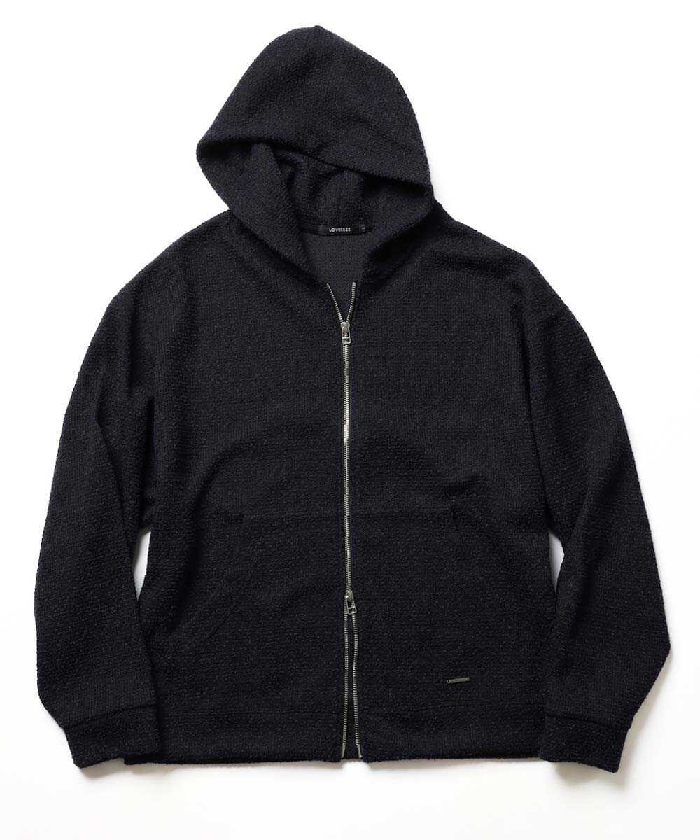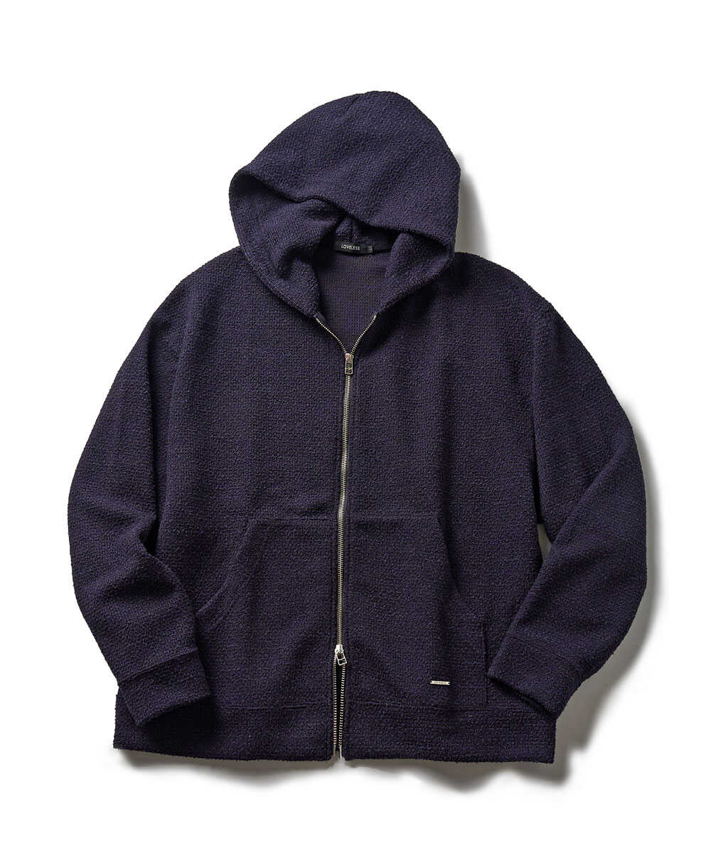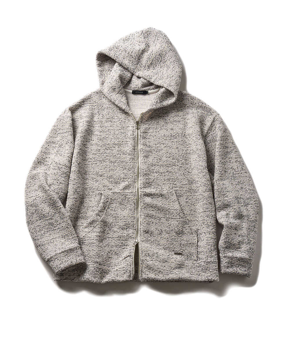 スウェットパーカ特有のカジュアル感を抑え、より大人らしい上品さを狙うなら〈ラブレス〉の別注ジップアップパーカが適任。美しい立体感とリッチな表情が魅力のデザインで、リラクシーでありながらも都会的なエレガンスを放つ1着だ。特筆すべきは、3種類の繊維をブレンドしてツイード調に編み上げたというこだわりの素材使い。この独特のふっくらとした風合いが、お洒落のギアを一段引き上げてくれる。