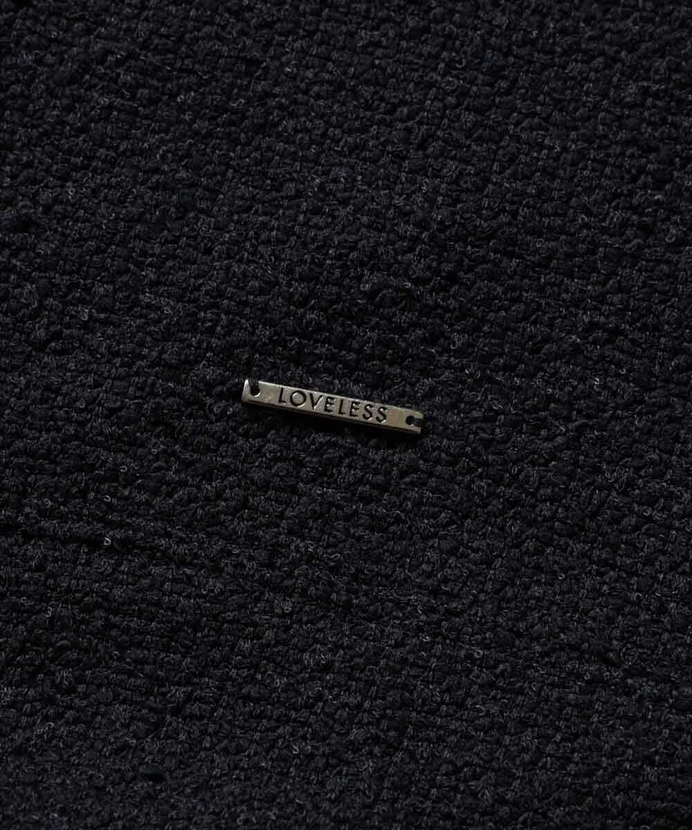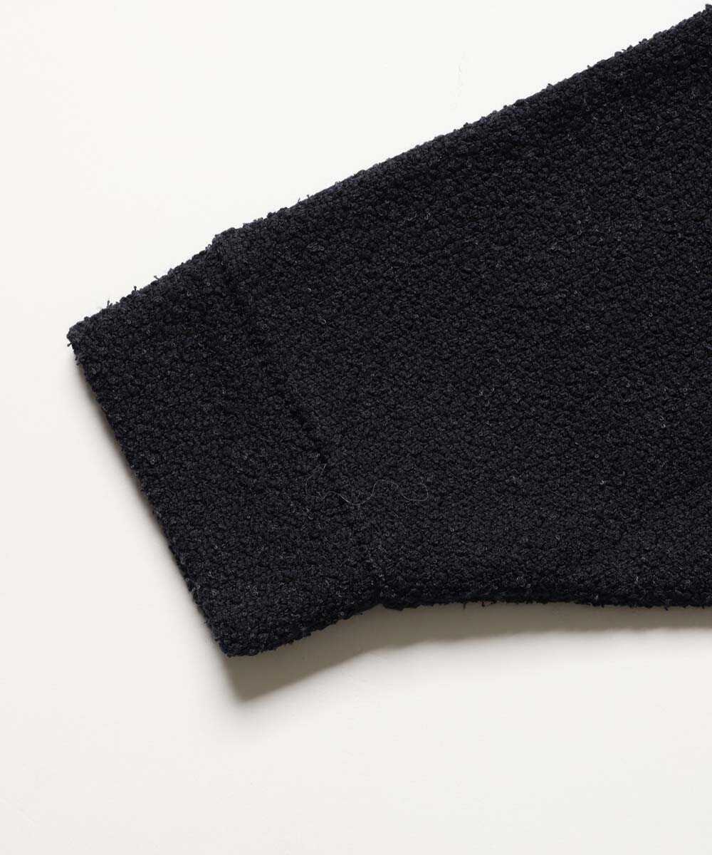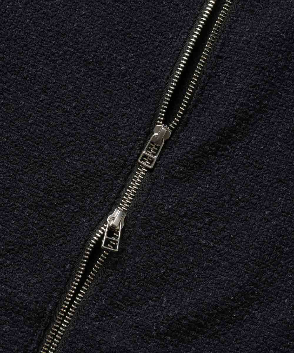 ポリエステルをベースにコットンとレーヨンをブレンドし、丁寧に編み上げられたツイード調のニット生地。見た目には重厚感と品格がありながら、実際は驚くほど軽量でソフトな肌触りを実現している。フロントには上下どちらからでも開閉できるダブルジップ仕様を採用しており、インナーの見せ方やシルエットのアレンジが自在。ポケット部分にはブランドロゴを刻んだメタルプレートが配され、さりげない輝きが高級感を後押ししている。