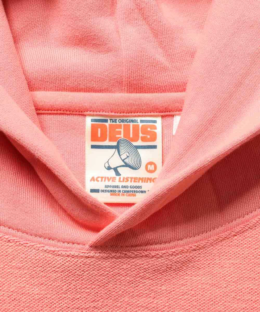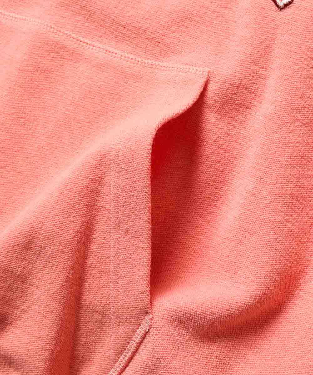 周囲と差のつく着こなしを楽しみたいなら、〈デウス エクス マキナ〉のプルオーバーパーカがおすすめ。モデル名が示すとおり、身頃と両袖をあえて裏地使いにした"インサイドアウト"のデザインが最大の特徴だ。フロントのロゴ刺繍も裏側の糸使いをあえて表に見せるという徹底したこだわりぶりで、シンプルながらも圧倒的な個性出しにひと役買っている。テンションの上がるフラミンゴピンクのカラーリングは、デニムとの相性も抜群で、春らしい明るいムードを演出してくれる。