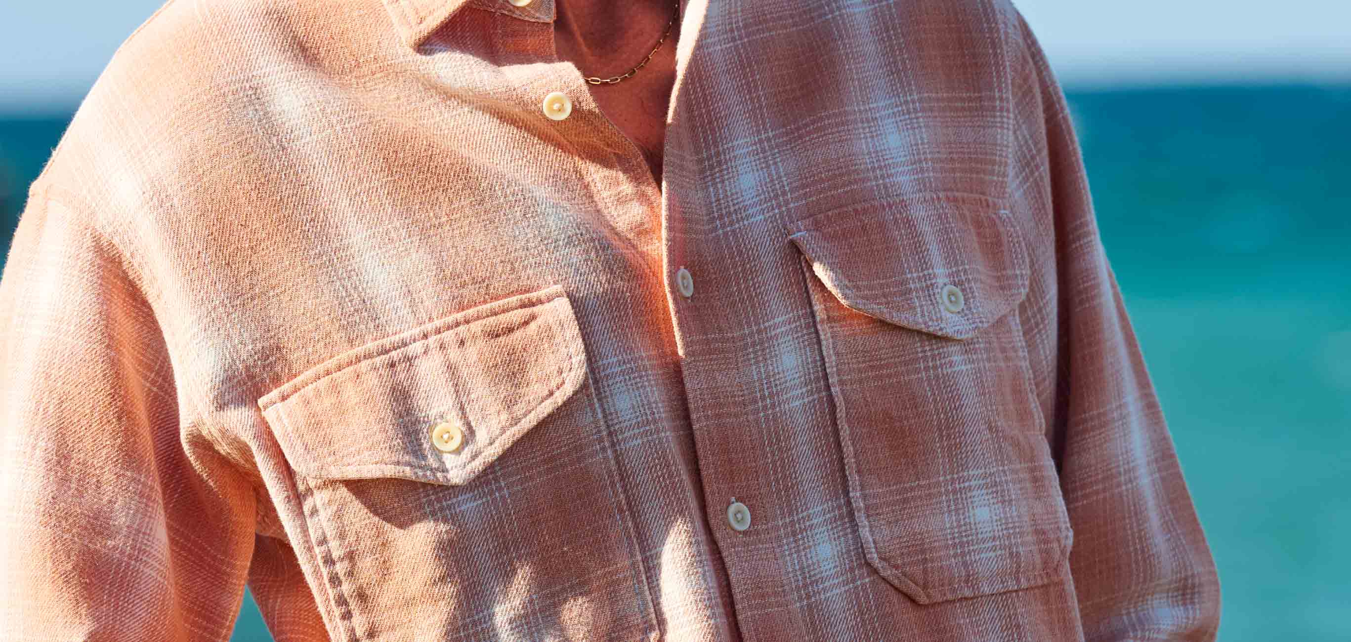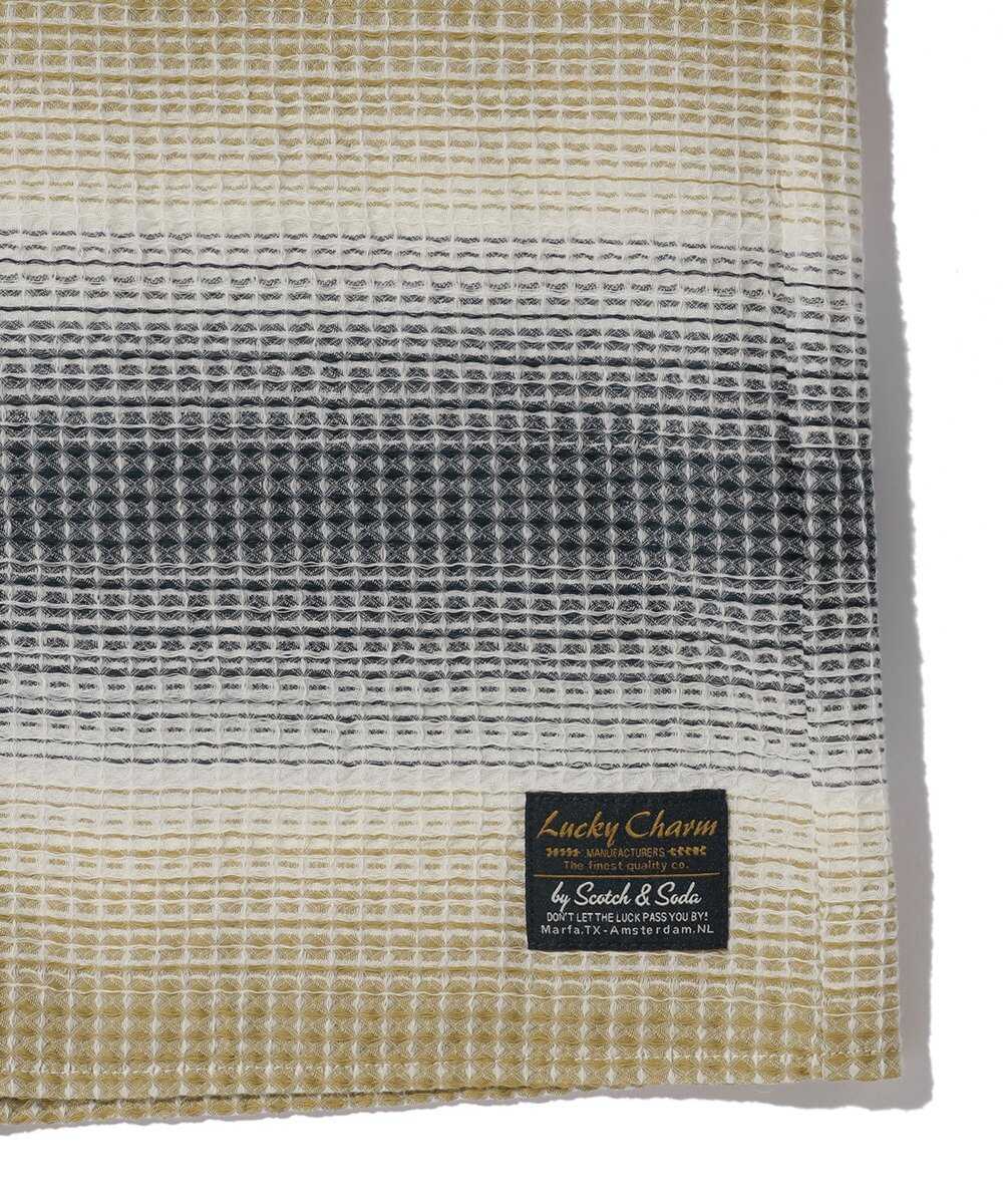 〈スコッチ アンド ソーダ〉から届いたのは、海辺の景色に映える見事なグラデーションカラーのシャツジャケット。羽織るだけでリゾート気分を味わえるような、開放感あふれるデザインがたまらない。特筆すべきは、独特の凹凸を持ったワッフル素材による適度な厚み。一般的な平織りのシャツとは違い、この立体的な生地が空気の層を作ることで、肌寒い日には適度な保温性を発揮し、汗ばむ陽気にはサラリとした心地よさをキープしてくれる。