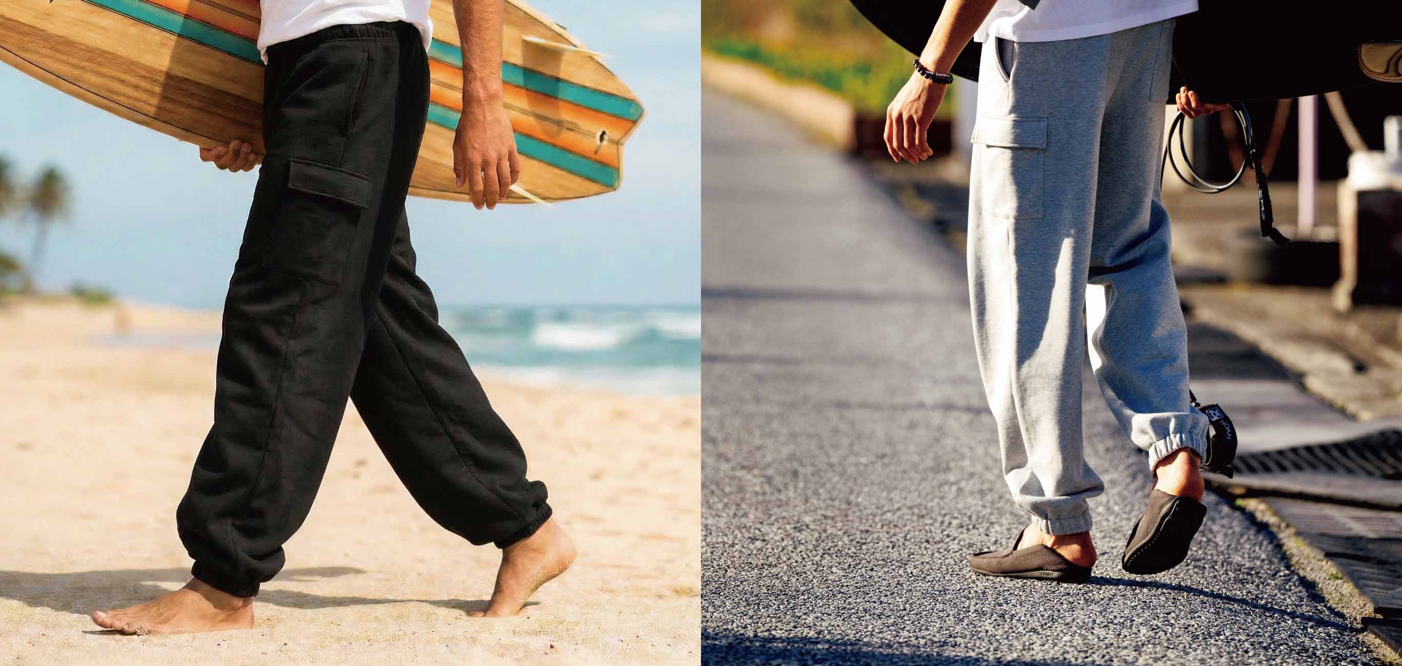 海沿いのカジュアルなライフスタイルを提案する〈アロハブルー〉から、リラックスフィットのストレートシルエットが特徴的なスウェットパンツが登場。裾ゴムのリブでほどよく絞られ、片ポケットのカーゴスウェットパンツだから野暮ったく見えない。これにより、ミリタリー由来の男らしさは残しつつも、土臭さを抑えたクリーンで都会的な印象に仕上がるってわけ。力の抜けた佇まいが肩肘張らない大人のサーフスタイルを格上げしてくれる。