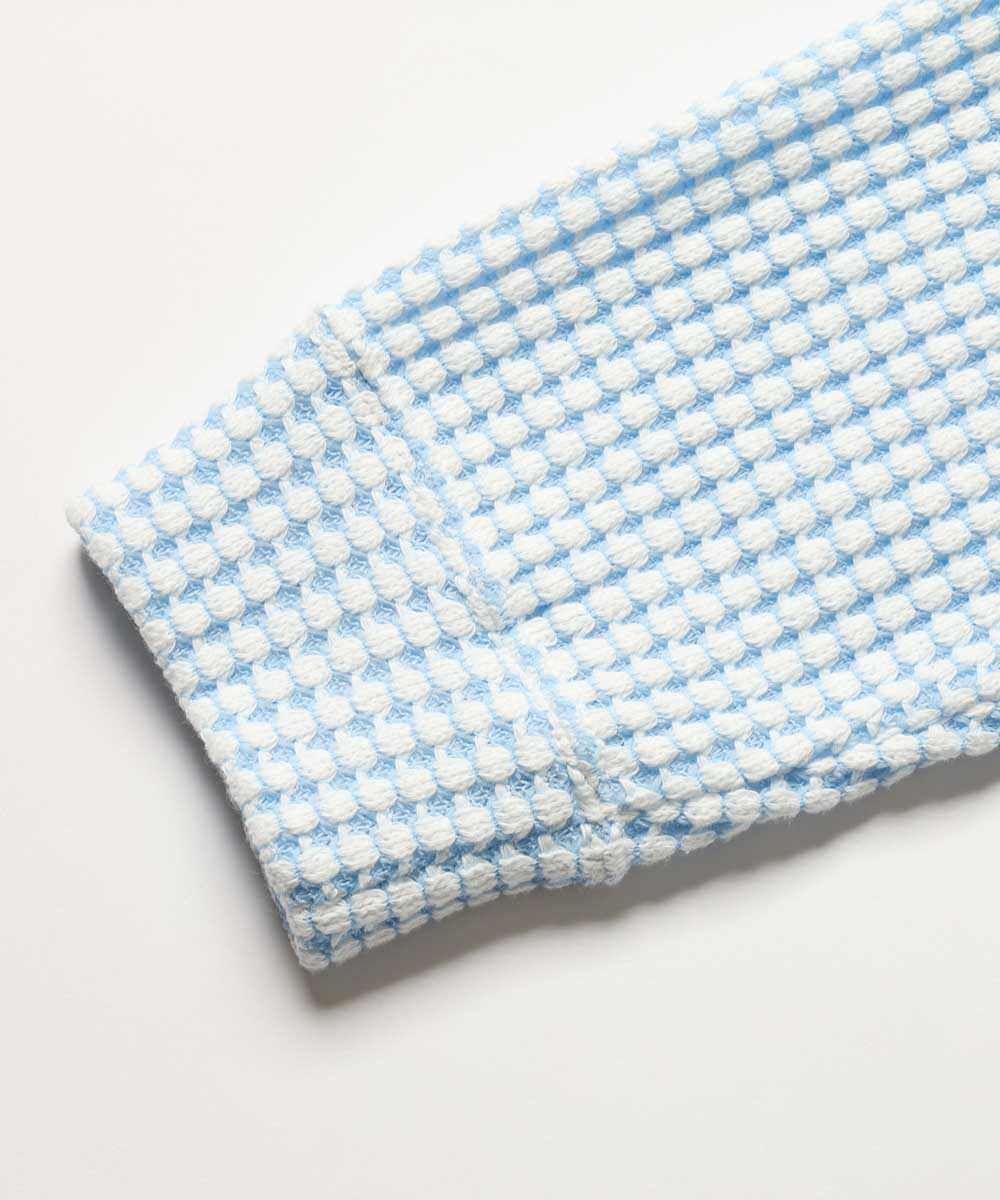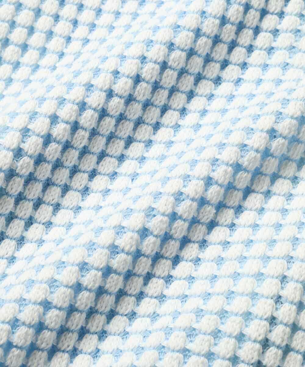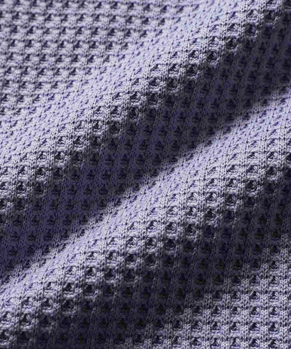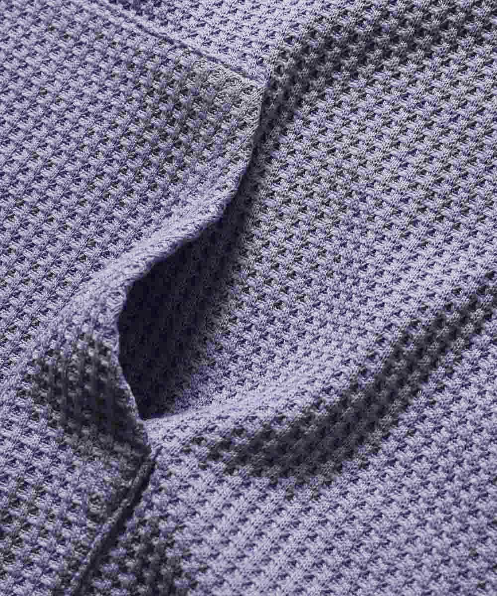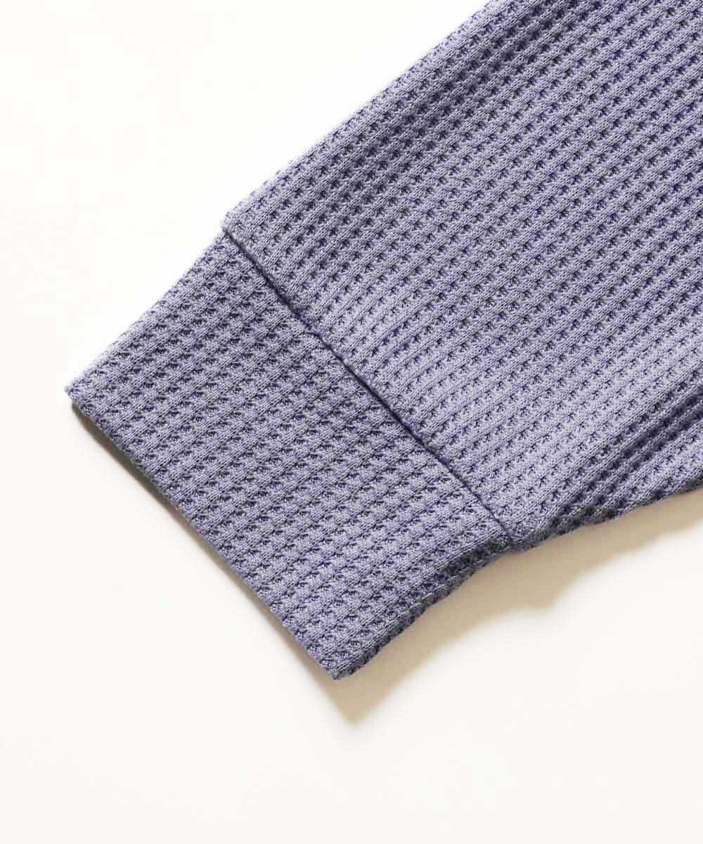 最大の特徴は、国内でも数少ない希少な編み機を使用してふっくらと編み立てられたこの生地。一般的なワッフル素材よりも凹凸の目が大きく立体的なため、肌離れのよさが格段に優れている。また、コットンベースにポリエステルを混紡することで、型崩れしにくくソフトなタッチを実現。この大きな凹凸が優れた通気性と適度な保温性を生み出し、見た目にもリッチで表情豊かな素材感が、大人のカジュアルスタイルを一段上に引き上げてくれる。