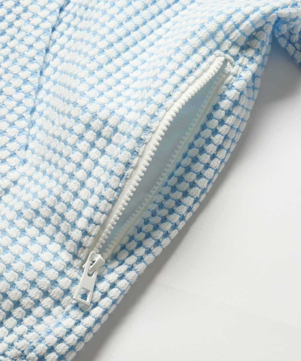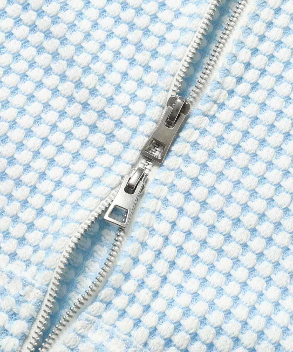 爽やかなサックスブルーのワッフルパーカは、クリーンで上品な大人の海スタイルにうってつけ。インナーにはシンプルな白Tシャツを合わせ、ダブルジップの上下を少し開けて抜け感を作るのがテクニック。ボトムスは爽快な淡青デニムがお似合いなのはもちろん、白やライトグレーの細身パンツで全体を淡いトーンでまとめれば、海辺のホテルやリゾート地のレストランにも違和感なく馴染む。簡単に洗練されたリラックスコーディネートに仕上がる1着だ。