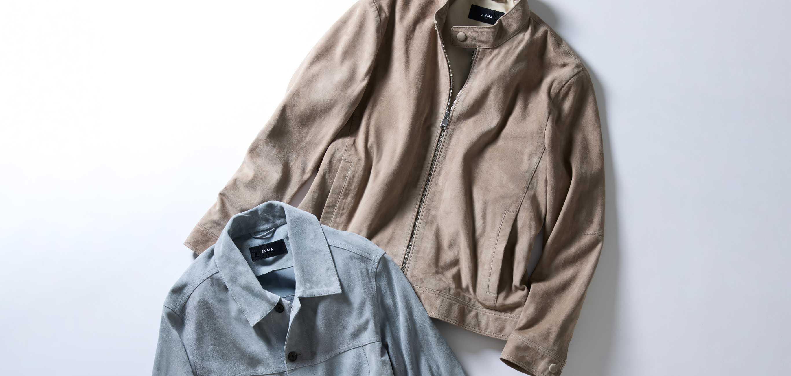 大人の男のワードローブにおいて、男らしさと風格を瞬時に高めてくれるレザージャケットは、いつの時代も必要不可欠な存在。しかし、春の陽気を感じる季節に、重厚な表革(スムースレザー)のジャケットは少し重たく、ハードすぎる印象を与えかねない。春らしく、エレガントな余裕を羽織るなら、断然正解なのはスウェードだ。マットで起毛感のある表情は、レザー特有の武骨さをマイルドに中和し、着こなしにリッチで知的な印象を与えてくれる。そんな極上の1着を探すなら、おすすめなのがシルエットと素材使いに定評のある〈アルマ〉。今回は、春の主役として大活躍間違いなしの新作2型をご紹介!