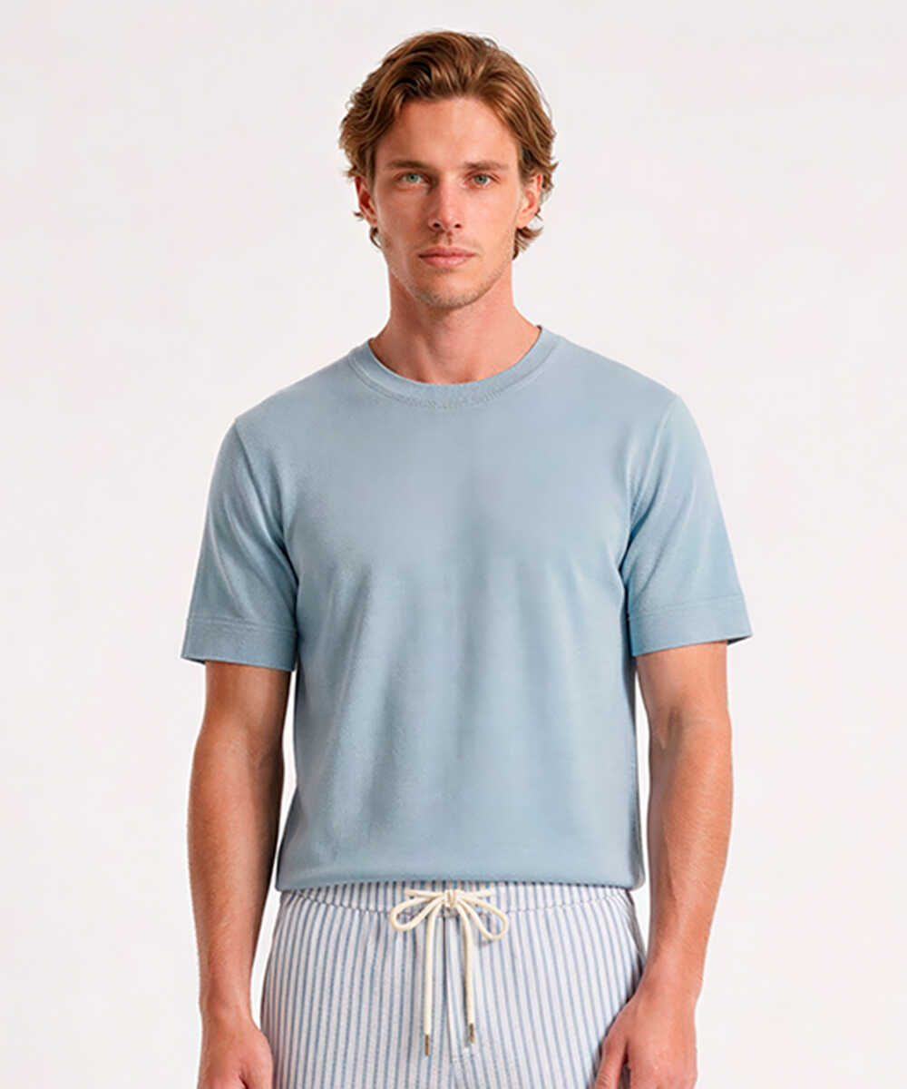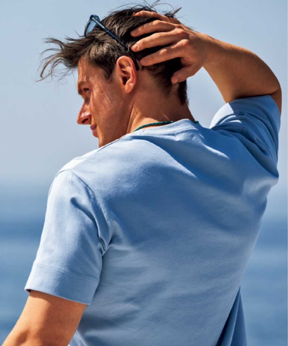 上質素材に、きれいな色落ちのライトブルー、ほどよい肉厚感、が合わさった贅沢なTシャツ。1枚でもサマになるし、ジャケのインにも使いやすい。