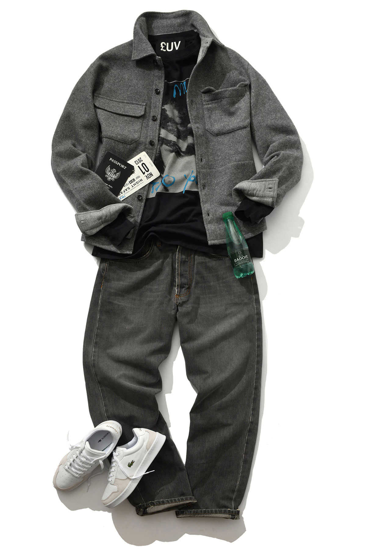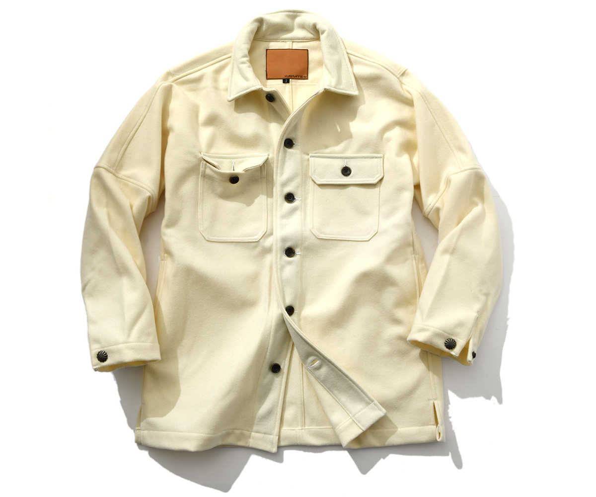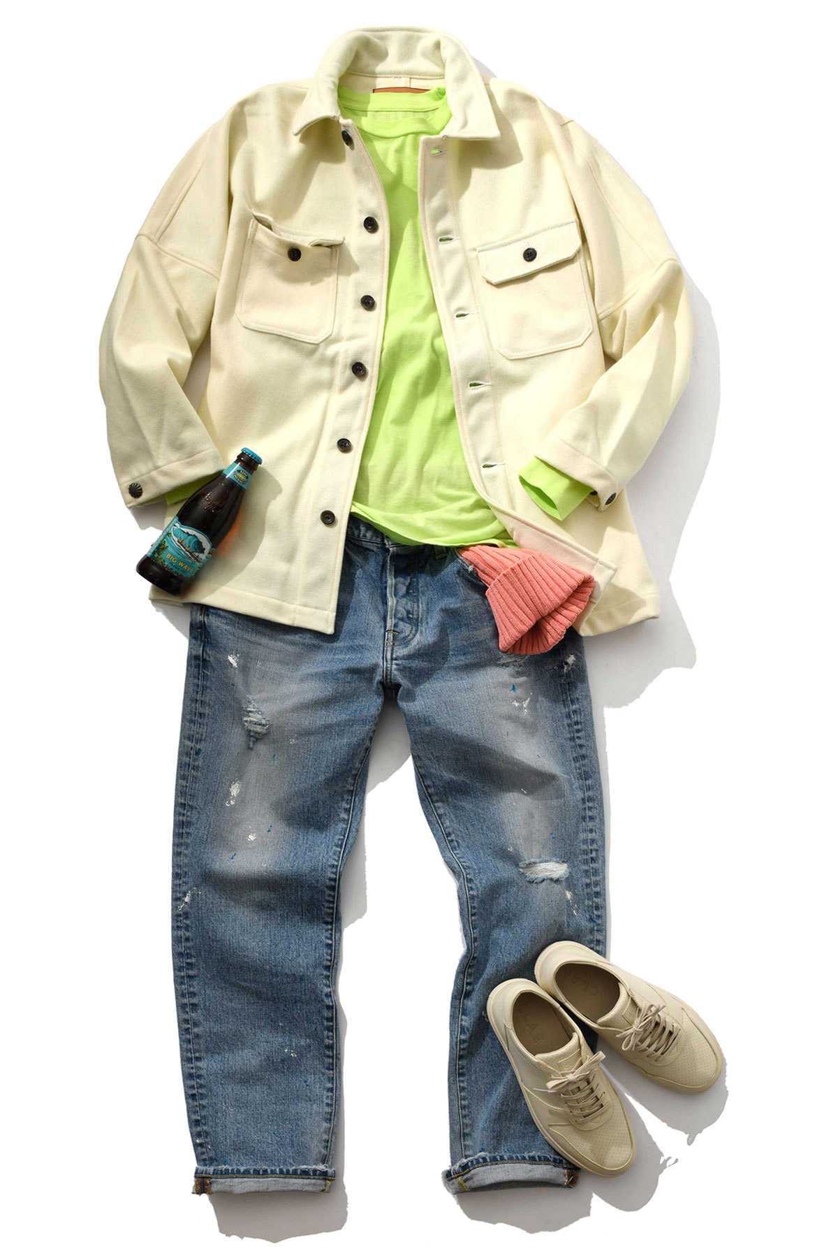 ウールをベースにしたフランネル製のシャツジャケットも、ホワイトを選べば軽やかな雰囲気。味感たっぷりの薄青デニムとも文句なしの相性だ。インナーや小物にペールトーンを散りばめて、春気分を盛り上げてほしい。