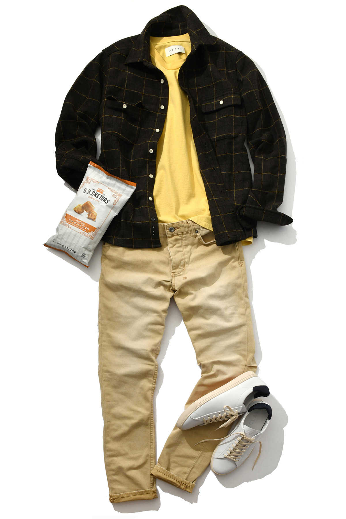 インナーもボトムもシャツジャケットのチェックと色リンク。武骨で男っぽいアイテムで構成していながら、同色にまとめることで柔らかで春の雰囲気も感じさせる仕上がりに。デニムの味感もドニゴールウールと好マッチ。