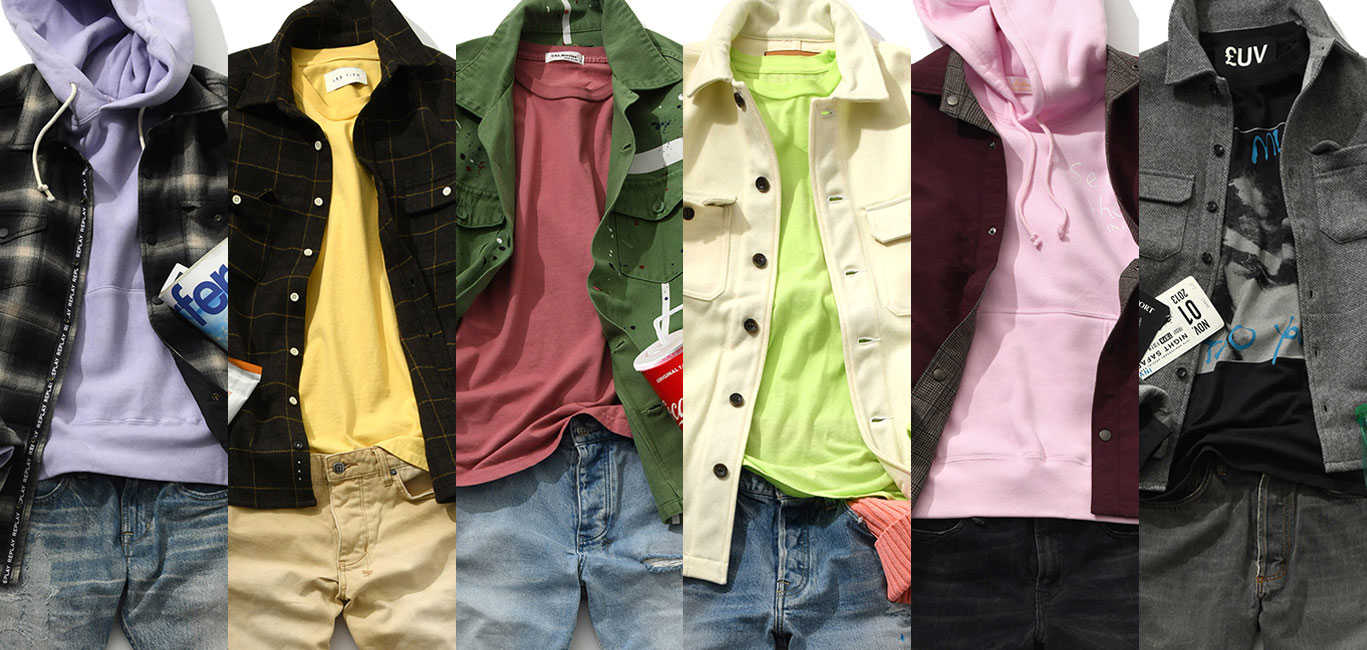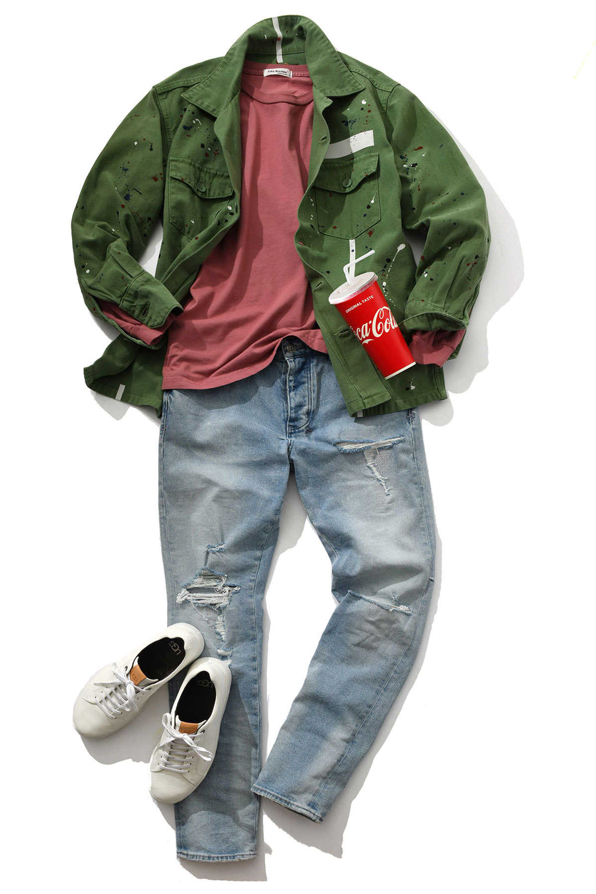 グリーンのシャツジャケット×ピンクのロンTで春を意識。ペインティングや色褪せ感などで適度に味をもたせたトップと、ハードなダメージを入れた薄青デニムも絶妙にマッチしている。JKの色を拾った足元が好バランス。