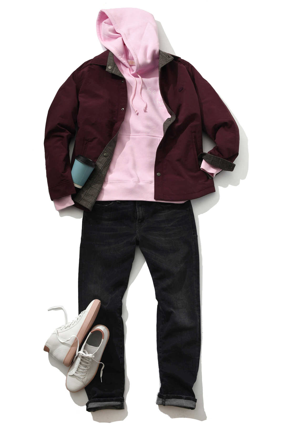 淡ピンクのパーカをインすることで、重たく見えがちなボルドーのシャツジャケットを春らしく軽やかに。ニュアンス付けからチラッと覗く裏面のグレンチェックが、オーソドックスなコーデの差し柄としても機能している。
