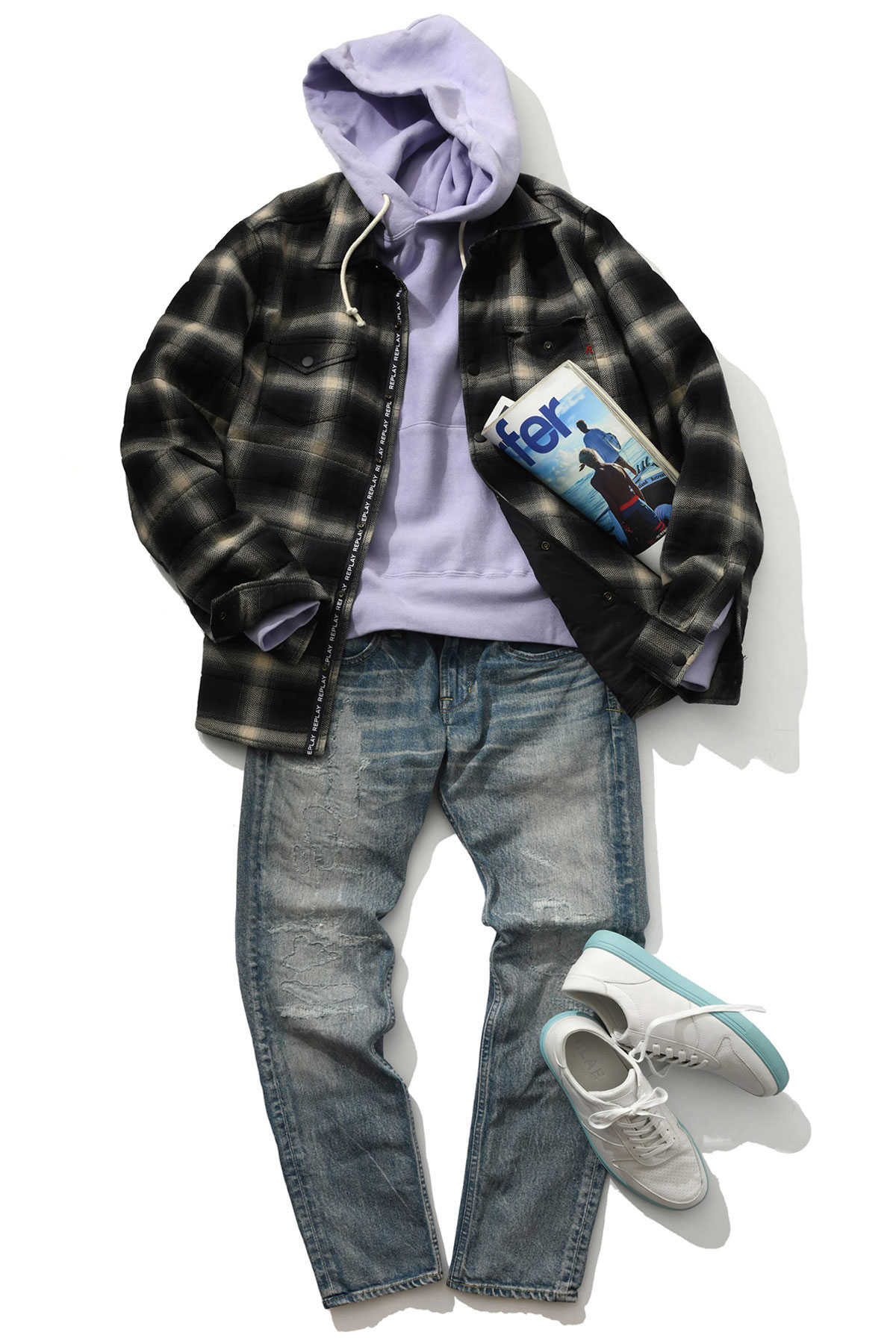 ラベンダーのパーカと薄青デニムの淡色コーデを、ダークトーンで構成したシャツジャケットでピリッと引き締め。独特の生地感がスタイリングに動きをもたせるから、定番の組み合わせもスタイリッシュな印象に導ける。