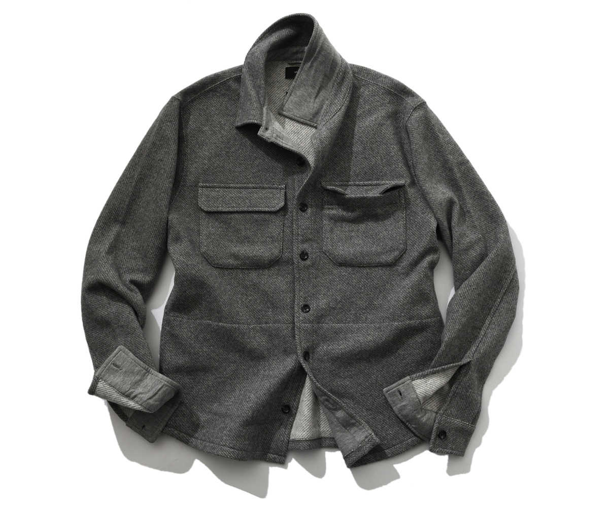 ウールを混紡したシャツジャケットは、適度に肉厚で軽めの防寒アウターとしても活躍。ダブルの胸ポケットを施したミリタリーデザインだけど、絶妙なシルエットのおかげで〈ヴィンス〉らしくどこか洗練されたムードも漂う。
