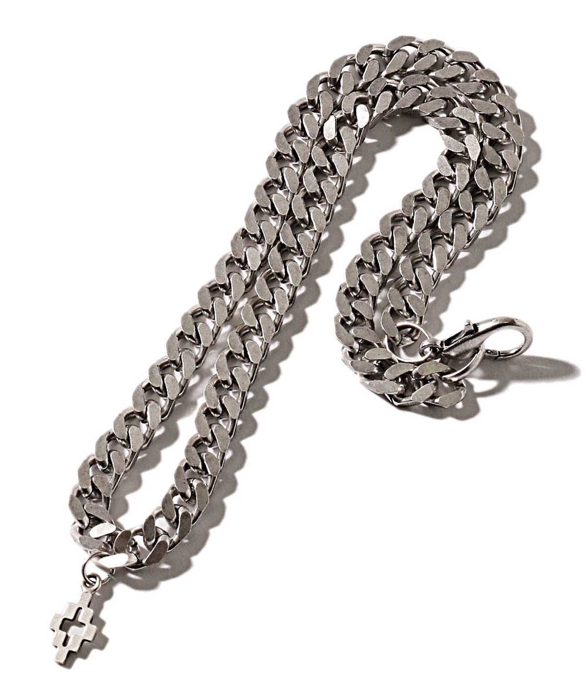 太めのチェーンはインパクト抜群。トップにさりげなくブランドロゴのモチーフを付けポイントに。薄着になる春先はこんなアクセントになる小物を選んで差をつけたい。