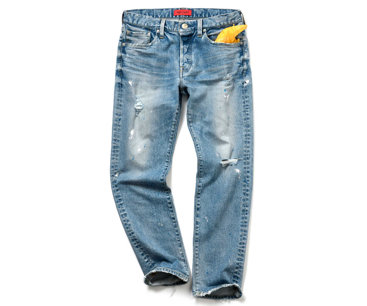 ジャスト丈&テイパードシルエットの定番モデル〝リズム〞を〈ラブレス〉と別注。ナチュラルな色落ちとアタリは、ヴィンテージと見紛うほど。爽やかな淡青でヌケ感も満点。
