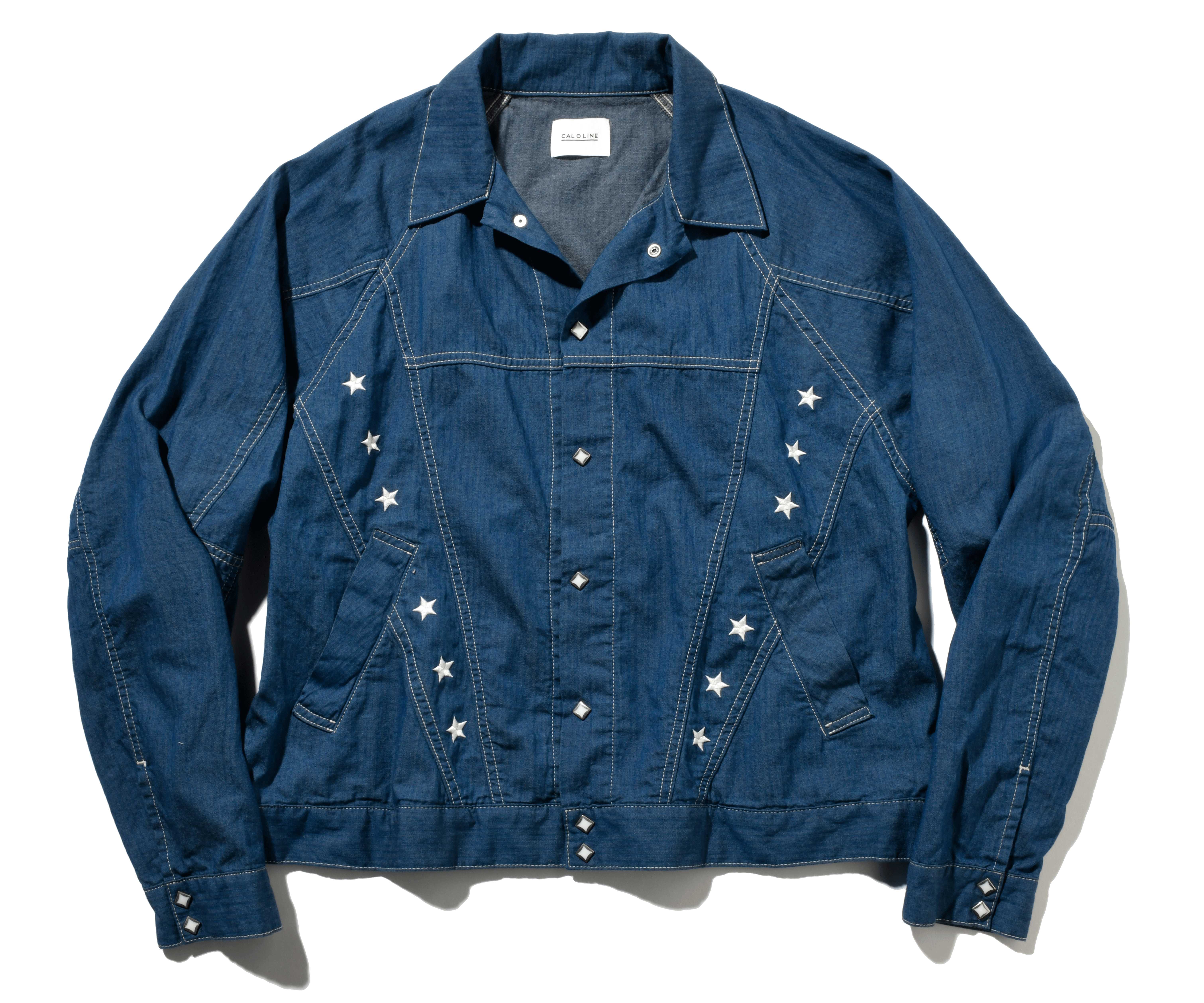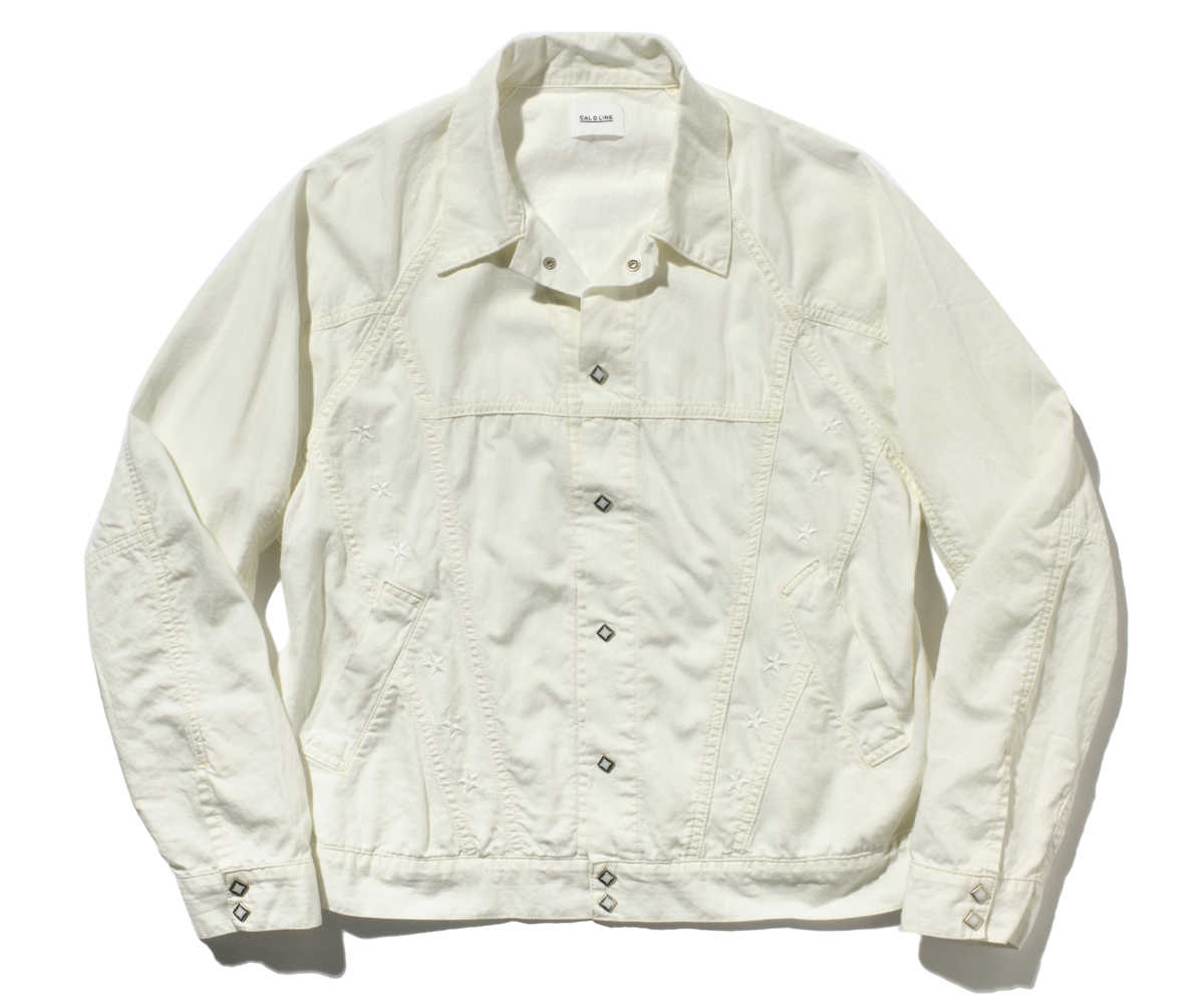 正統派デニムジャケットと、‘80sのDCデニムの要素を取り入れたウエスタンジャケット。パールドットボタンと随所に入れられた切り替えが特徴的。生地は柔らかなヘリンボーンデニムだから、アウターとしてはもちろん、シャツのように羽織ってもOK。前身頃に施された白糸の星の刺繍がデザインのアクセントに。