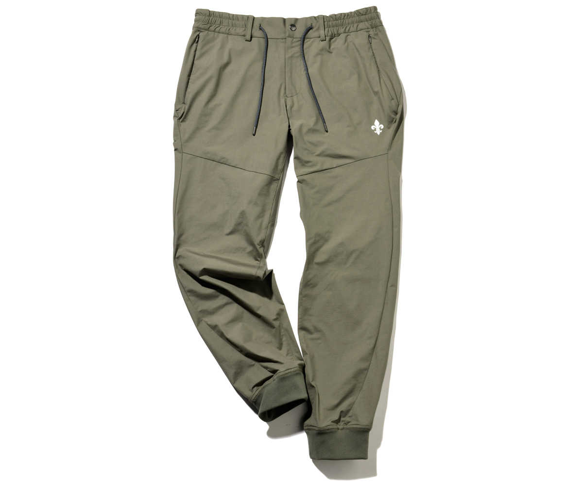 スタンドカラーブルゾンとセットアップで展開しているリブパンツ。ストレッチ性のある薄手のジャージに加え、立体的な切り替えも穿き心地を高めるのにひと役買っている。ほどよくテイパードした美しいシルエットを描くので、アクティブなシーンだけでなく街着としても活躍。今どきのスポーツMIXコーデに取り入れるのもおすすめ。