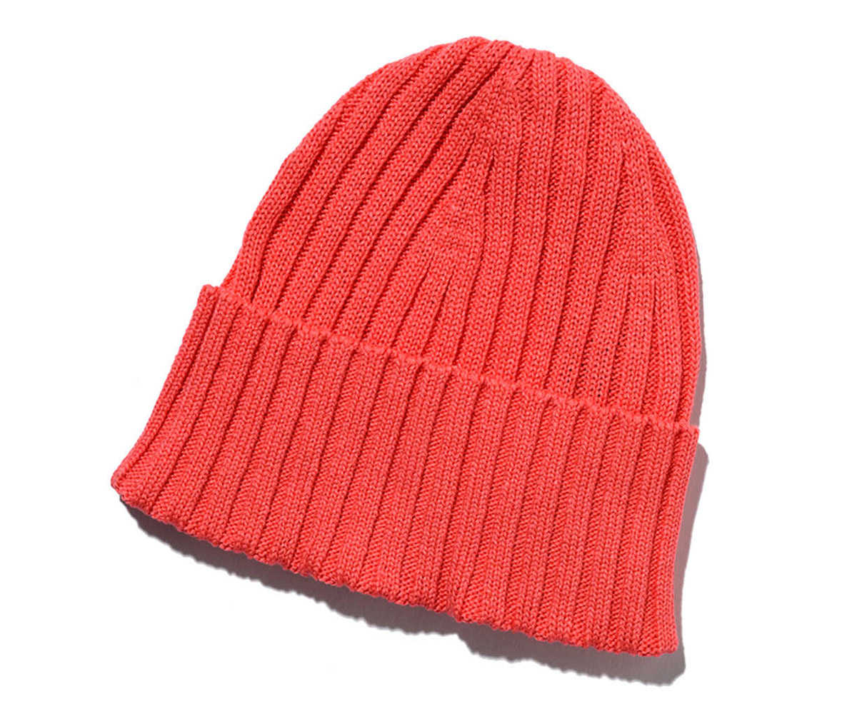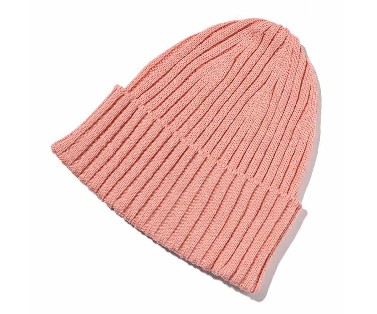 伸縮性が高く被りやすいリブのニットキャップは、濃淡ともにほのかに褪せた優しげなピンク。丸みの強い自然なシルエットだから、頭や顔の形を選ばない。