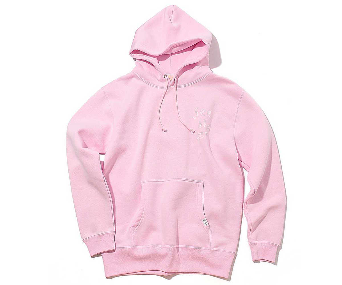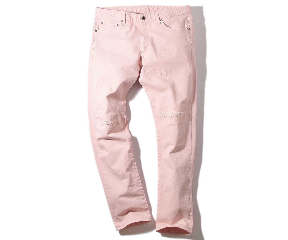 ストレッチ素材を混紡した10 ozデニムの細身モデル〝カリフ〞を、淡いピンクで仕立てた別注の1本。バイオ加工で生地に表情を加えたことで、嫌みのない色合いに。