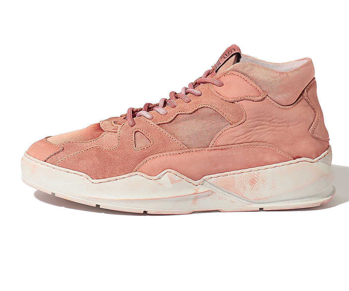 スウェードやキャンバスなど複数素材をレイヤリングしたアッパーを、ディップダイ=漬け染め加工でムラっけの強いカラーに仕上げた。味のある個性豊かな1足。